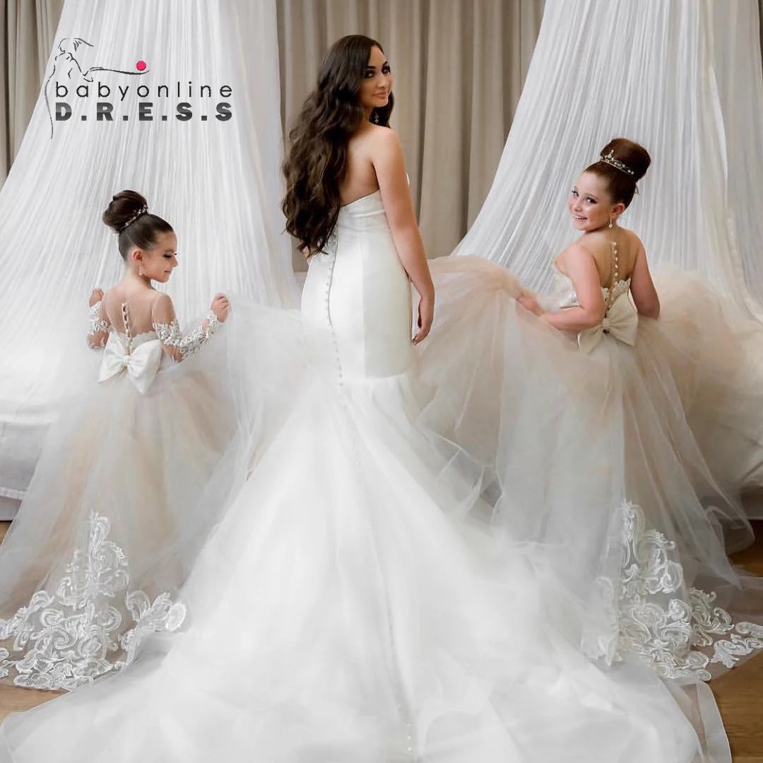 2024 Toddler Lace Tulle Flower Girls Dress Princess Kids Child Baptism Wedding Party Junior Bridesmaid Maxi Ball Gown Evening