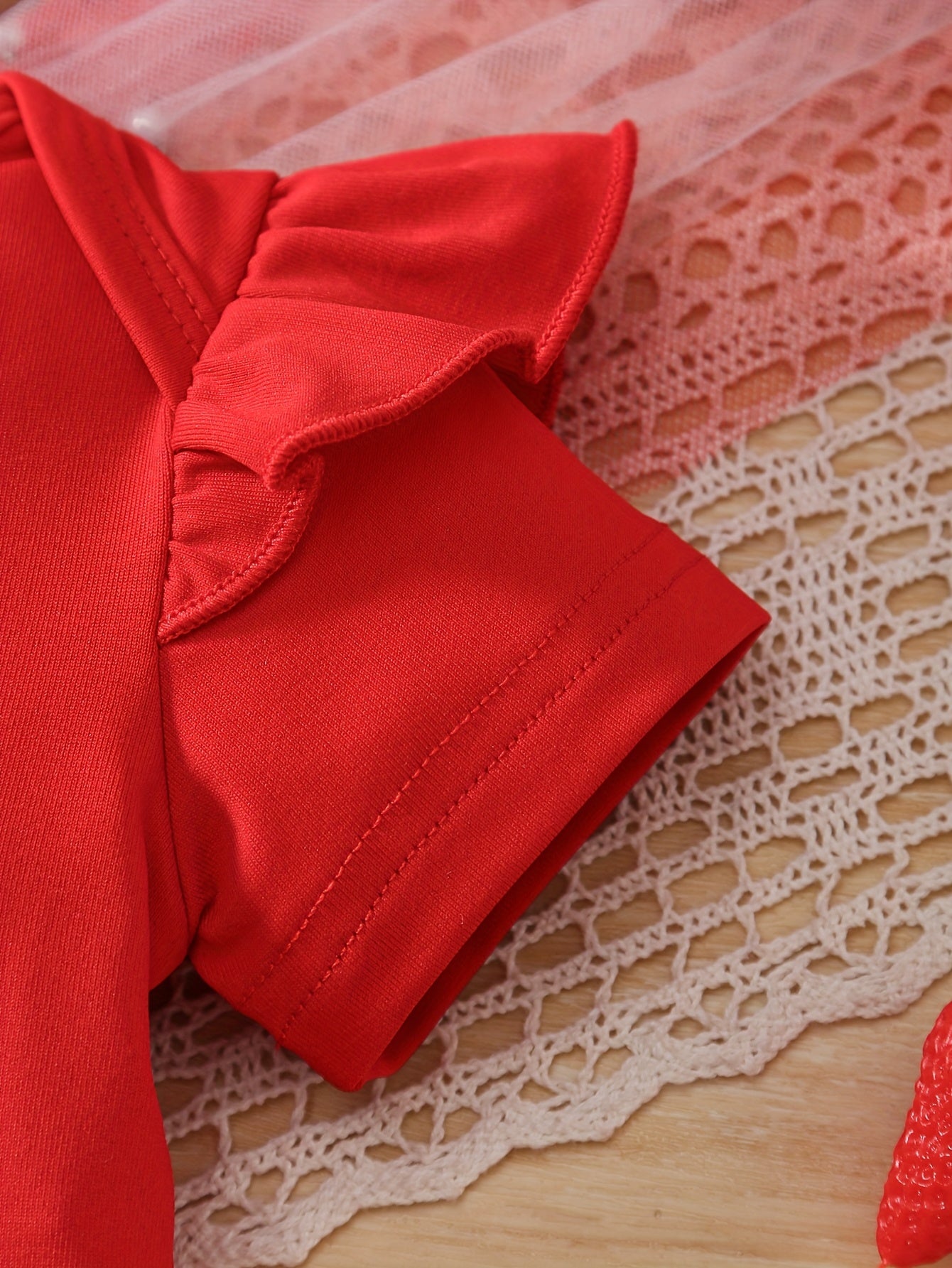 3pcs Baby Girl Summer Short Sleeved Strawberry Letter Jumpsuit&bow Full Print Trumpet Pants&headband Cute Three Piece Baby Girl, Perfect for Outdoor