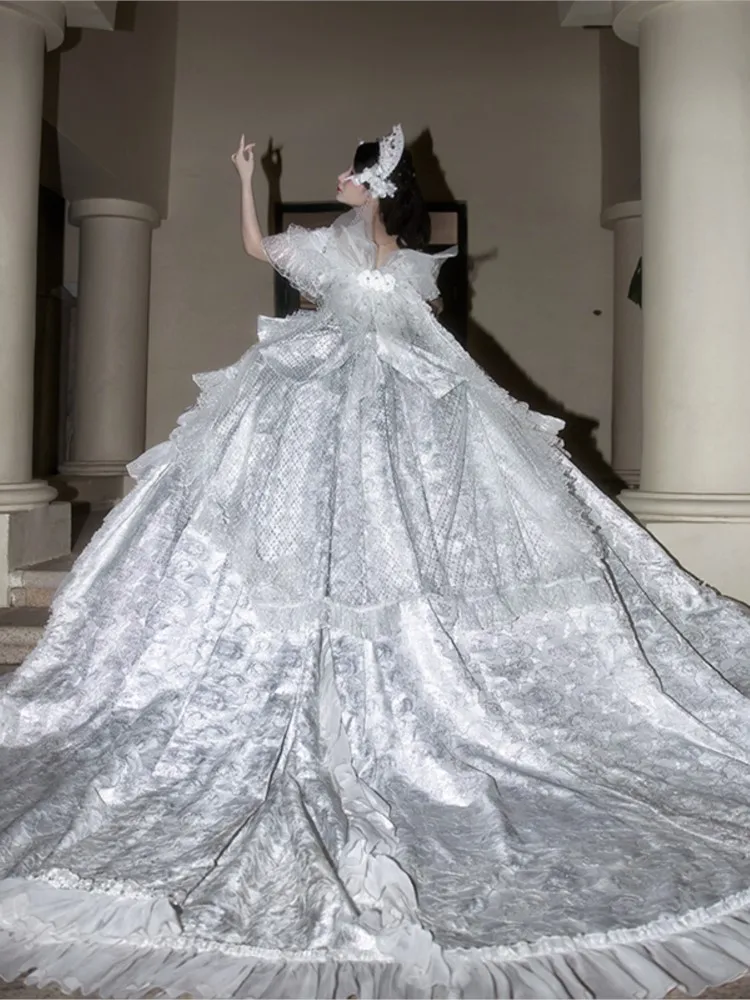 The picture color set includes: skirt +4 small brooches 1 large brooch bead chain + crown + flower clip + dual-purpose headscarf and back gauze + necklace + flower ball bag + large train tail.