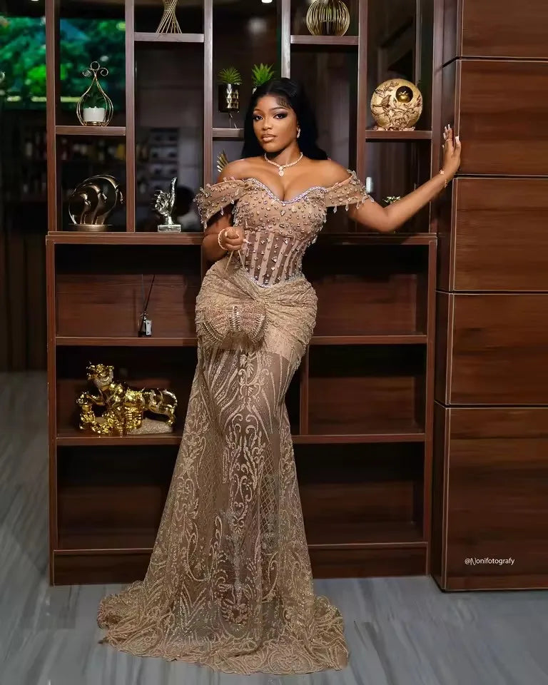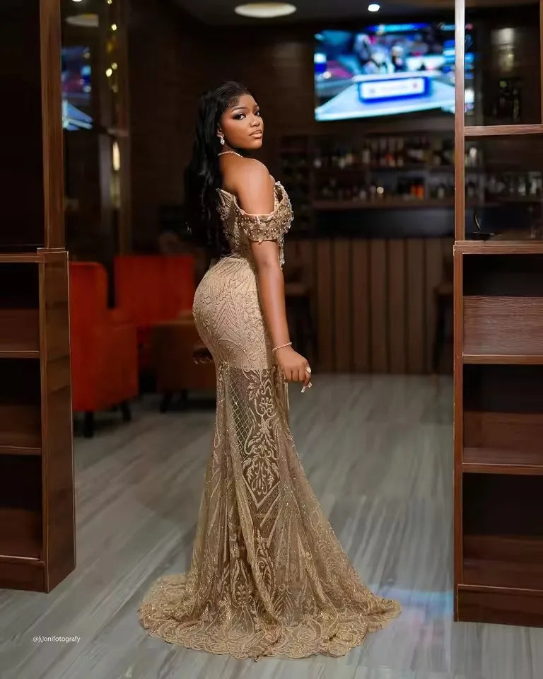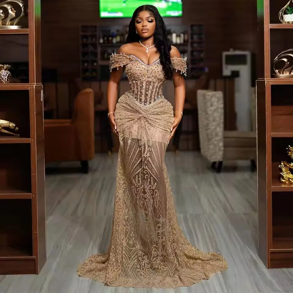 African Champagne Lace Prom Dresses with Rhinestones Off Shoulder Mermaid Black Girls Birthday Dress Formal Party Gowns Customiz