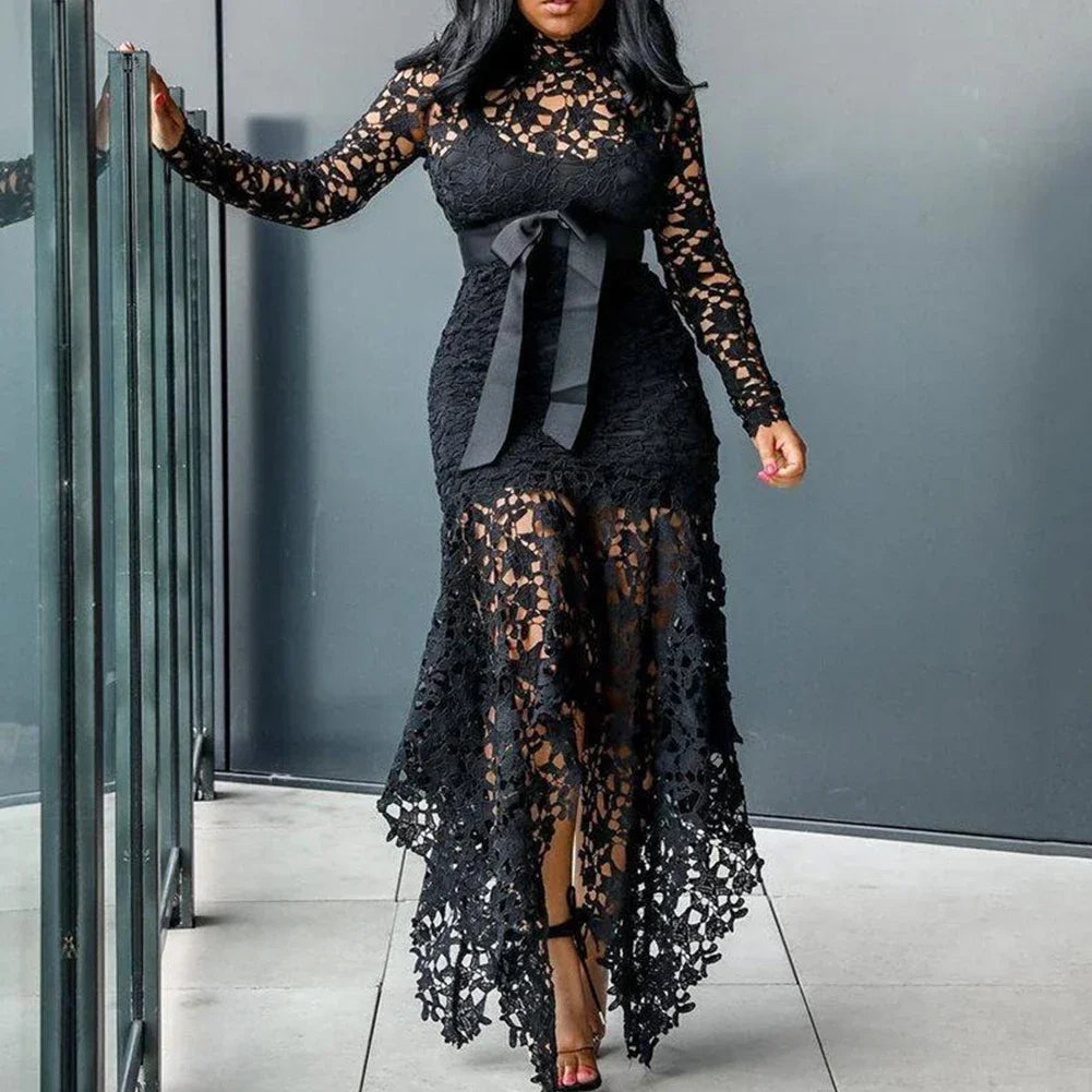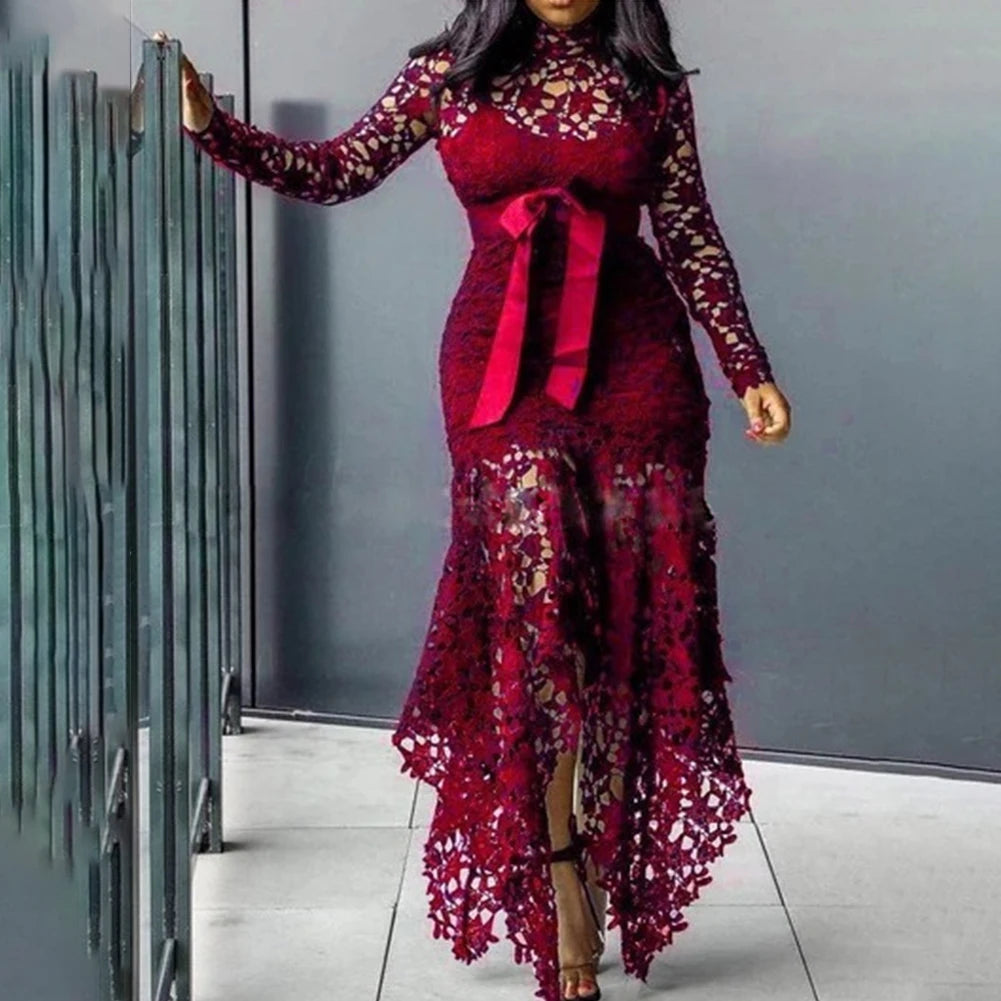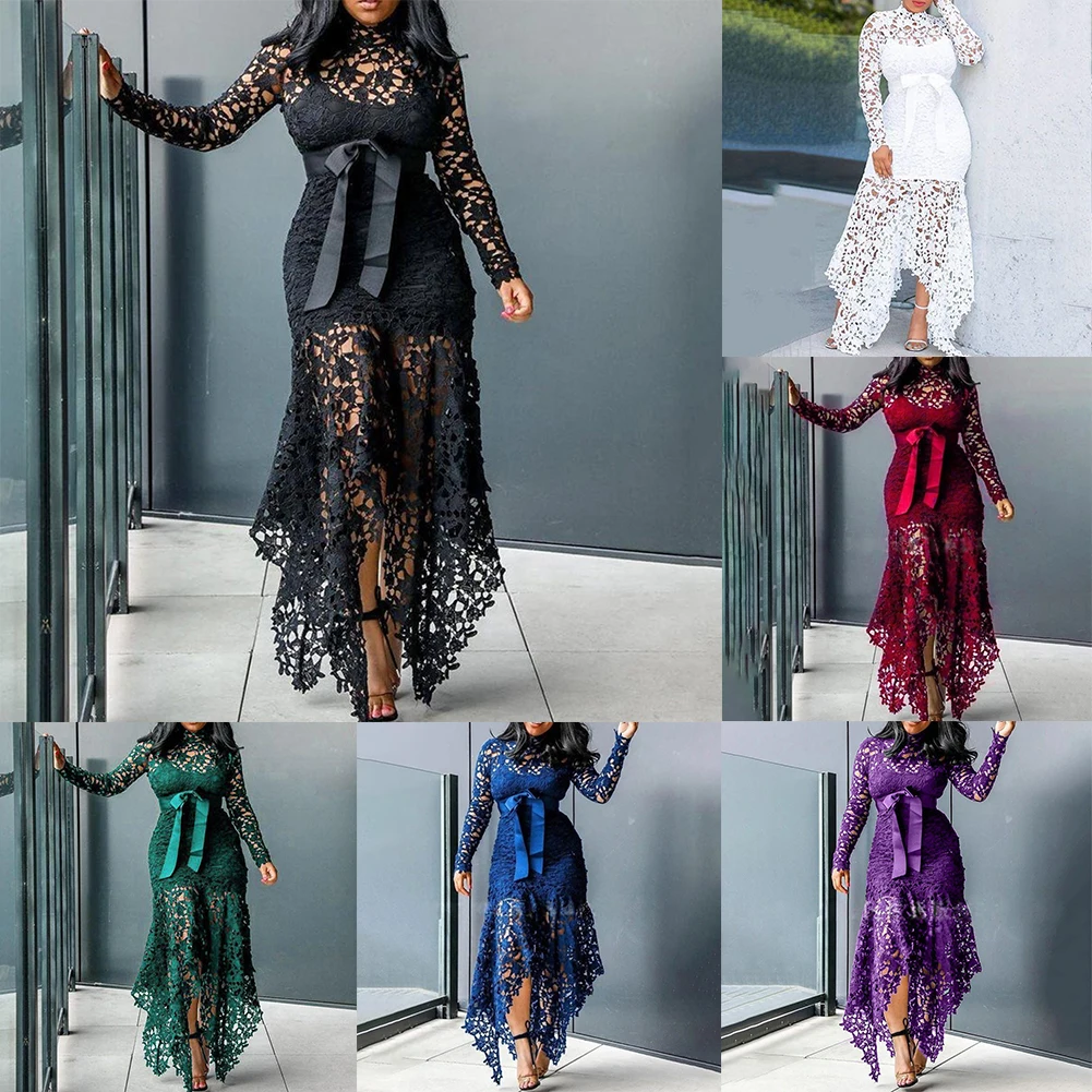 African Ladies Evening Gown Dresses Sexy Lace Long Sleeve Stand Collar Strappy Irregular Elegant Plus Size Long Dress Wedding