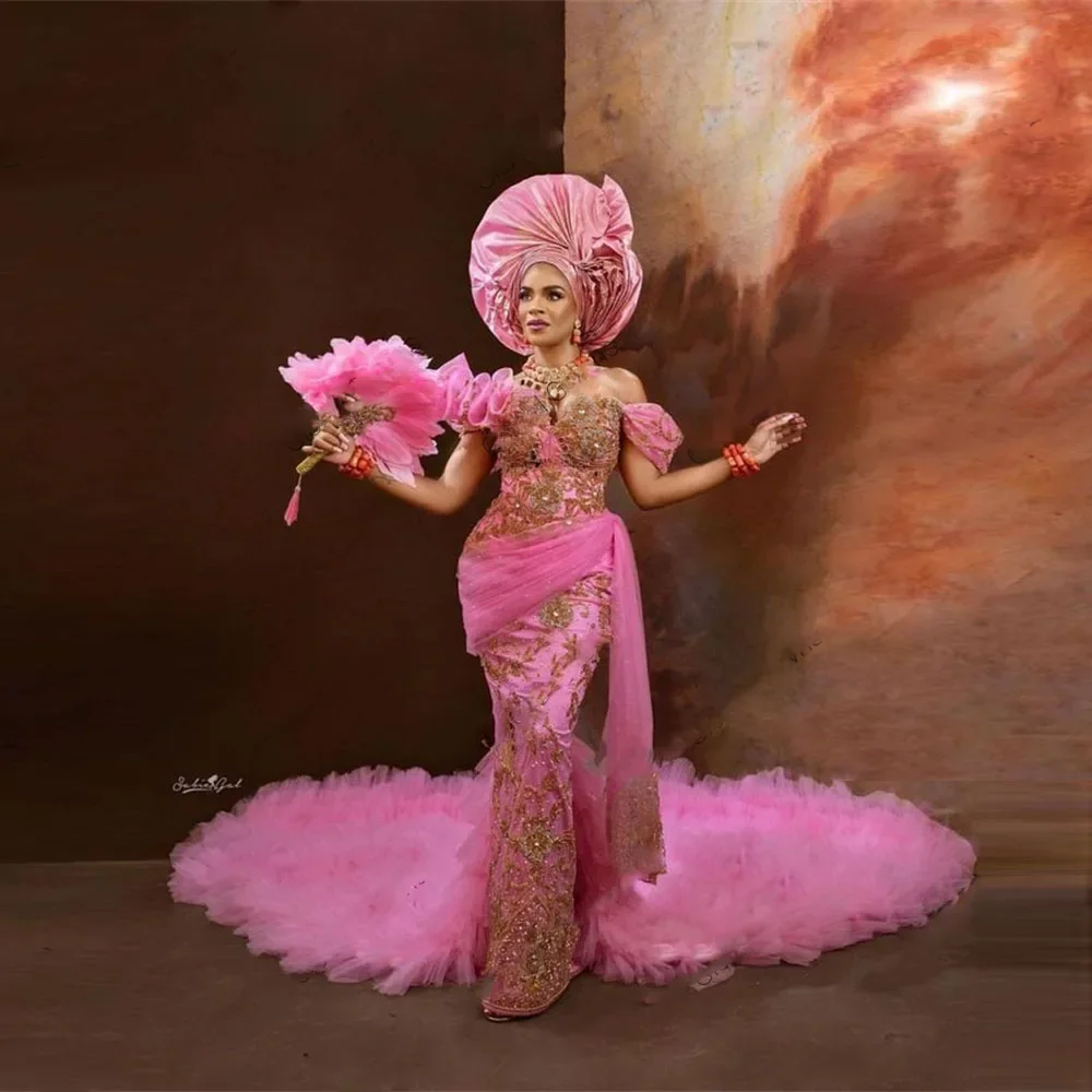African Off The Shoulder Bead Evening Dress Long Overskirt Asoebi Pink Evening Dresses Luxury Nigerian Evening Gowns Crystals
