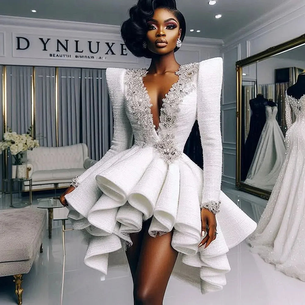 African Women Prom Dresses With Deep V Neck Lace Appliques Beads Ruffles Evening Dress vestidos de fiesta Girls Birthday Gowns