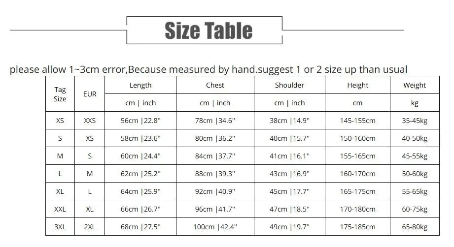 please allow 1~3cm error,Because measured by hand.suggest 1 or 2 size up than usual