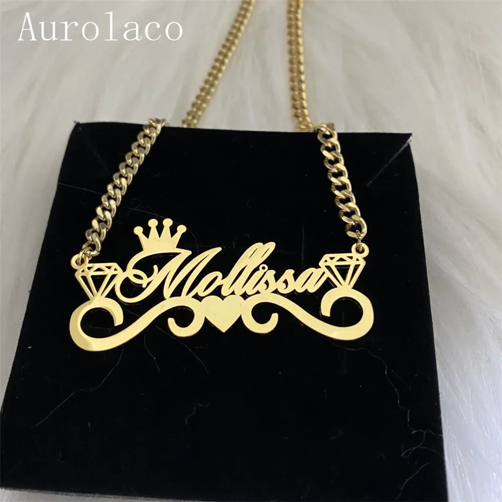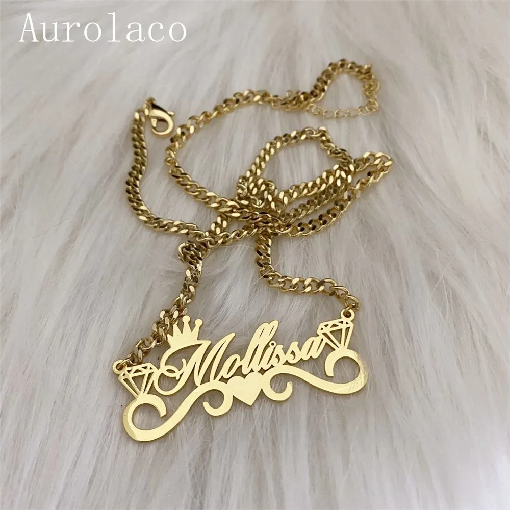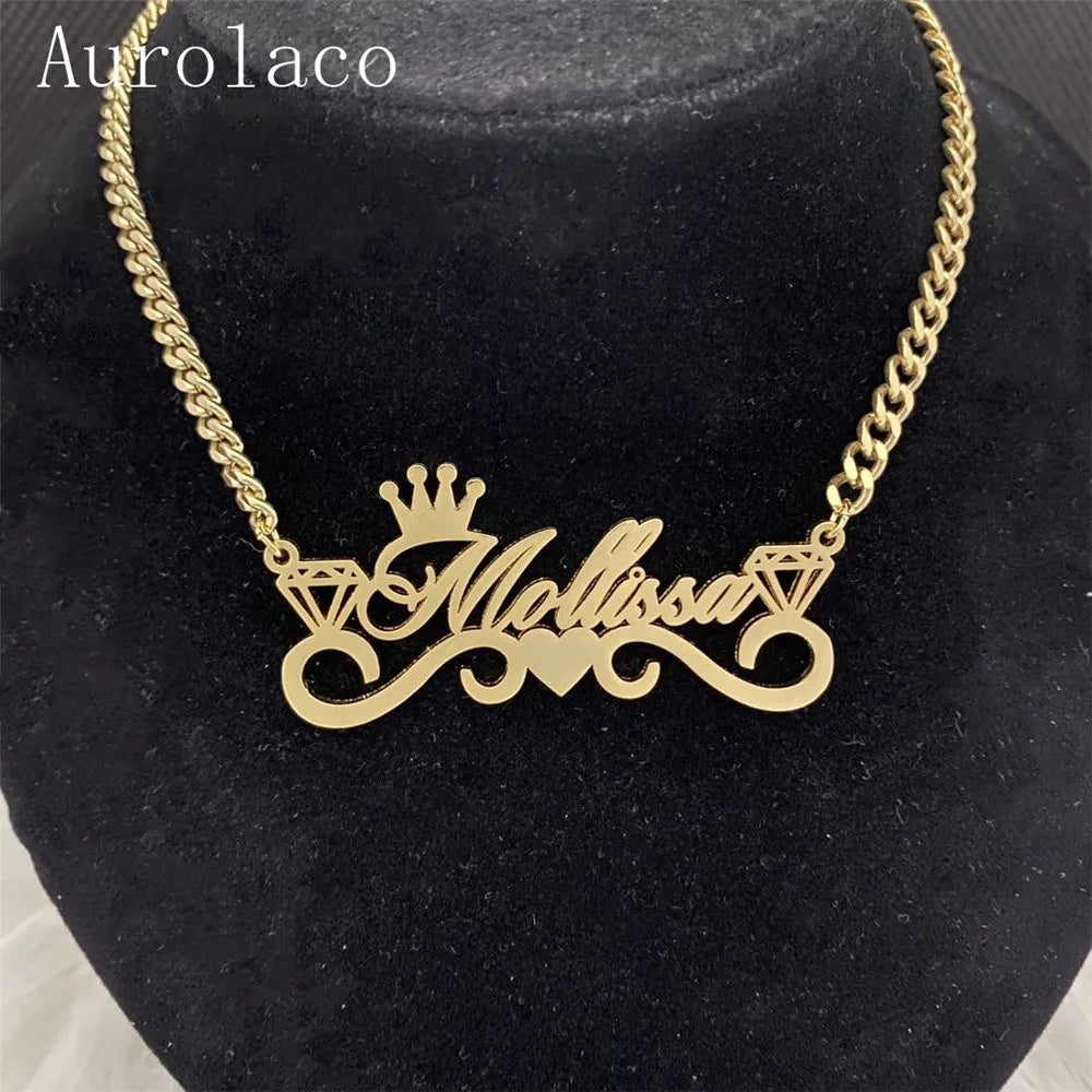 AurolaCo Custom Name Necklace with Crown Personalized Cuban Chain Necklace Stainless Steel Nameplate Necklace for Women Gift