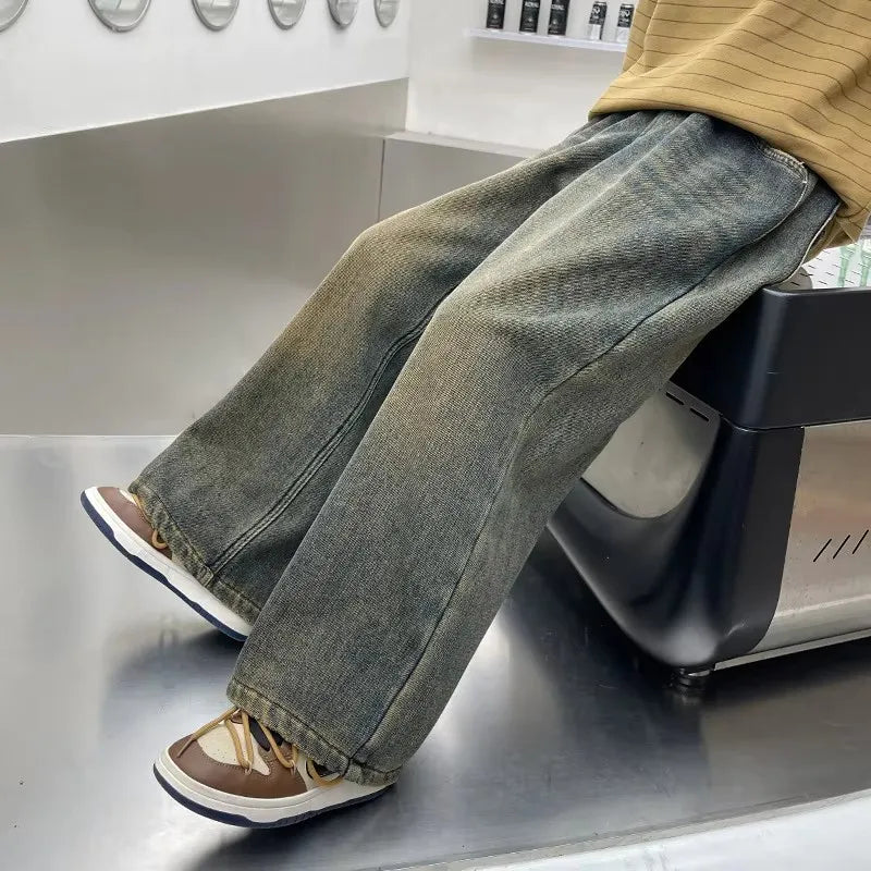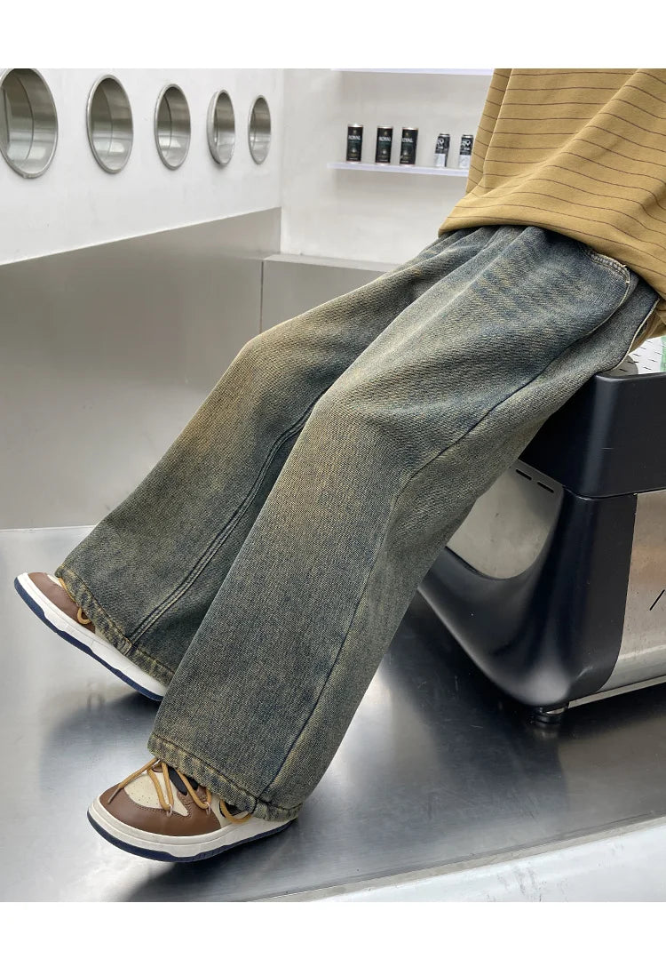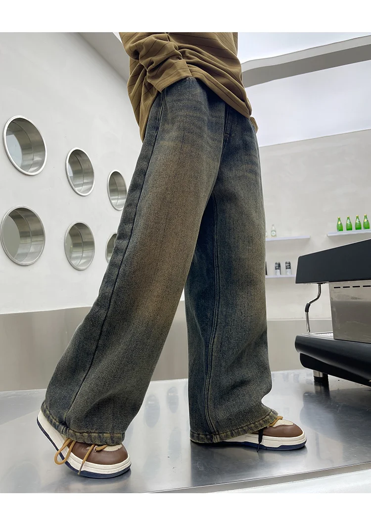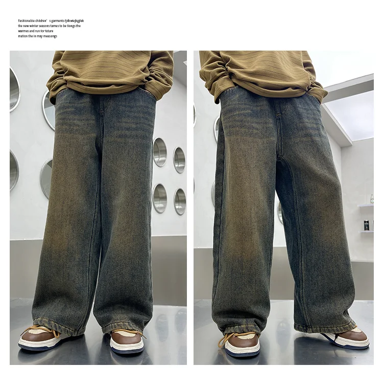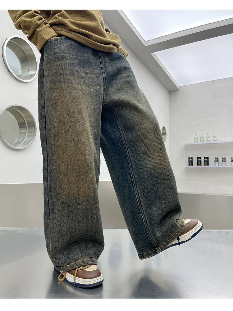 Autumn Winter School Boy Insulate Jeans Denim Pants Streetwear Child Retro Blue Straight Cut High Waist Warm Thermal Trousers