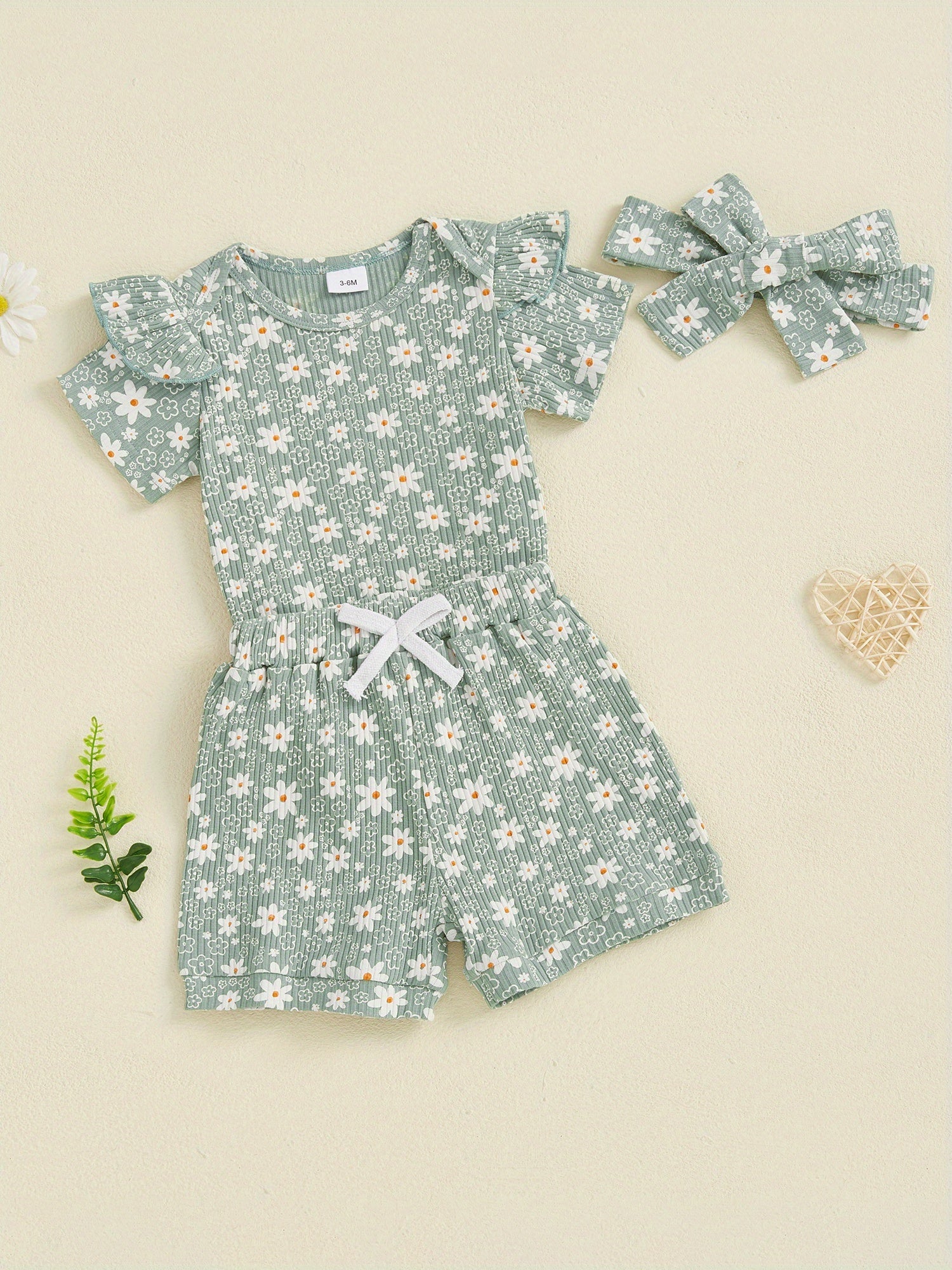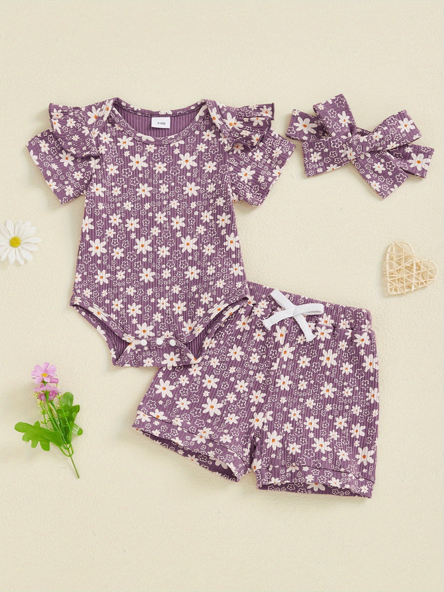 Baby Girl Summer Outfits Floral Print Crew Neck Short Sleeve Romper Shorts Headband 3pcs Clothes Set