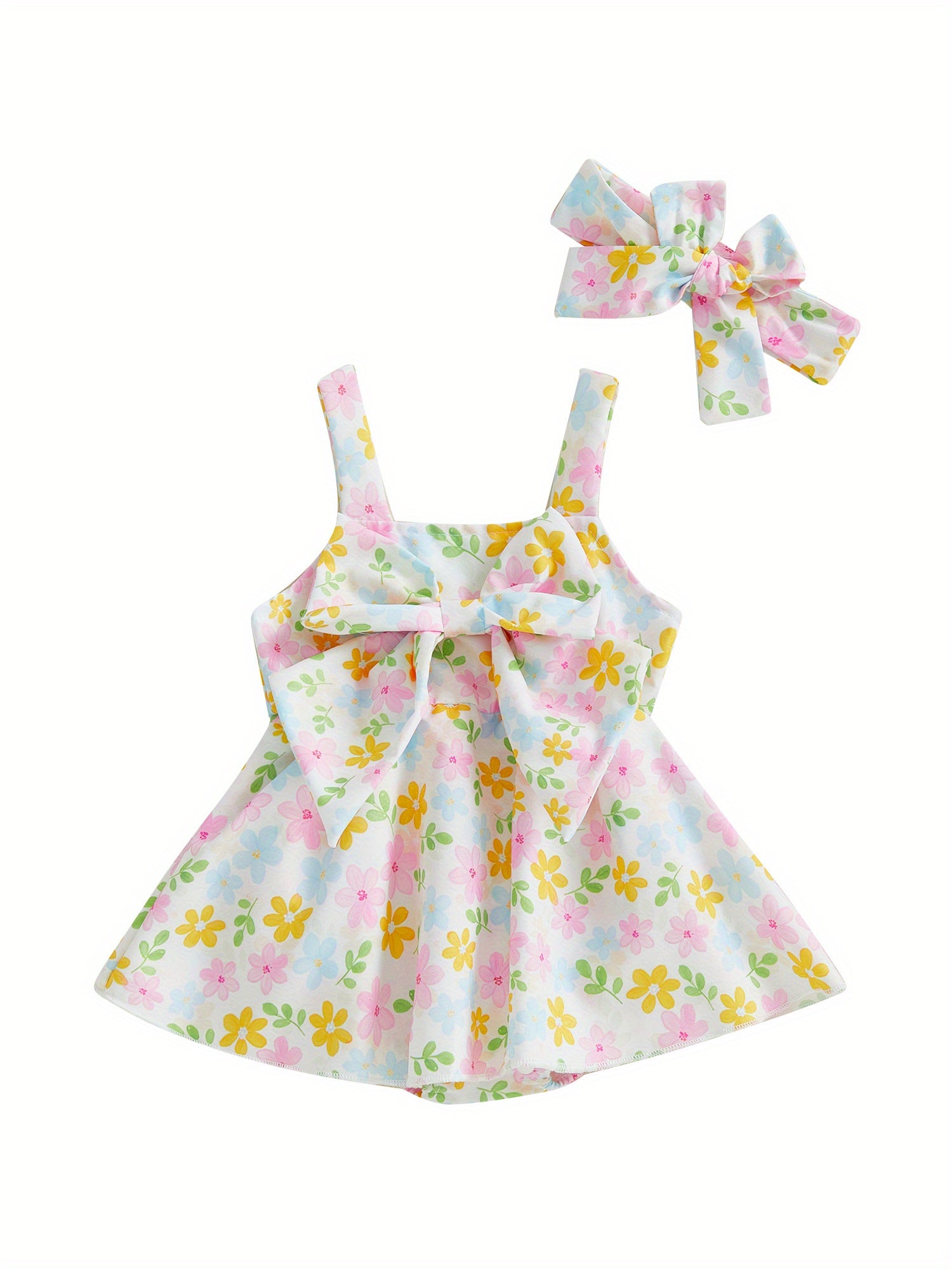 Baby Girl Summer Outfits Sleeveless Square Neck Bow Front Romper with Headband Set Newborn Clothes