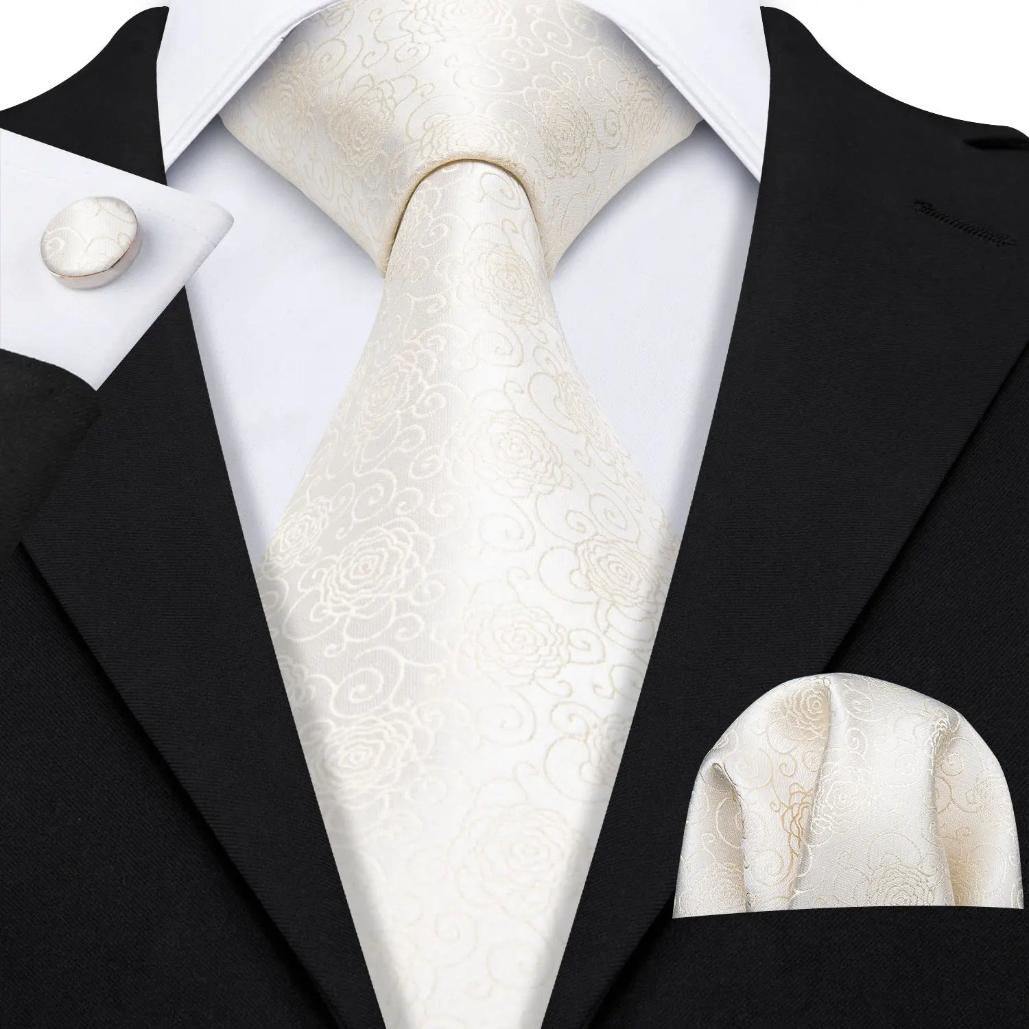 Barry.Wang Gold Beige Yellow Brown Tulip Silk Men Tie Handkerchief Cufflink Set Jacquard Necktie for Male Wedding Business Party