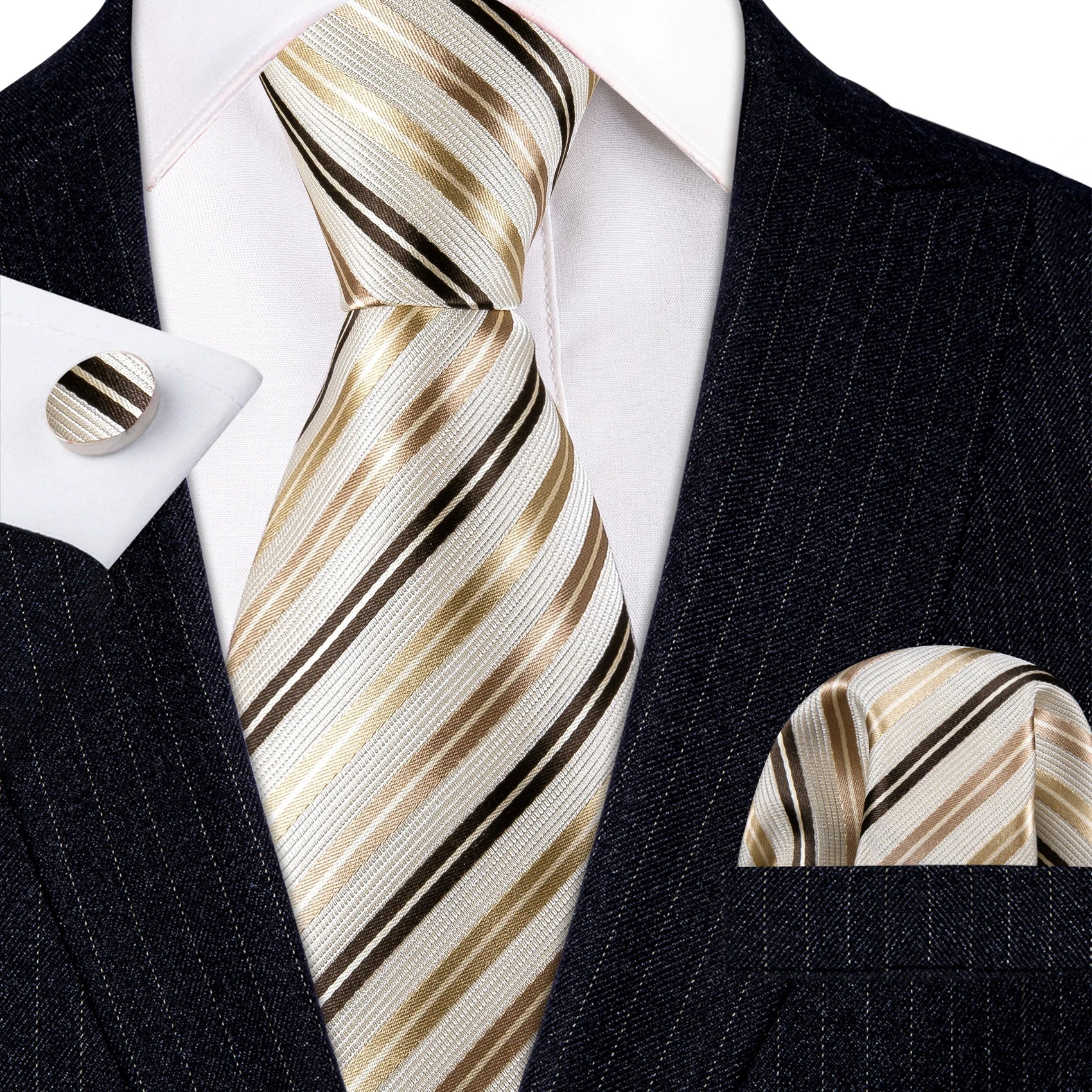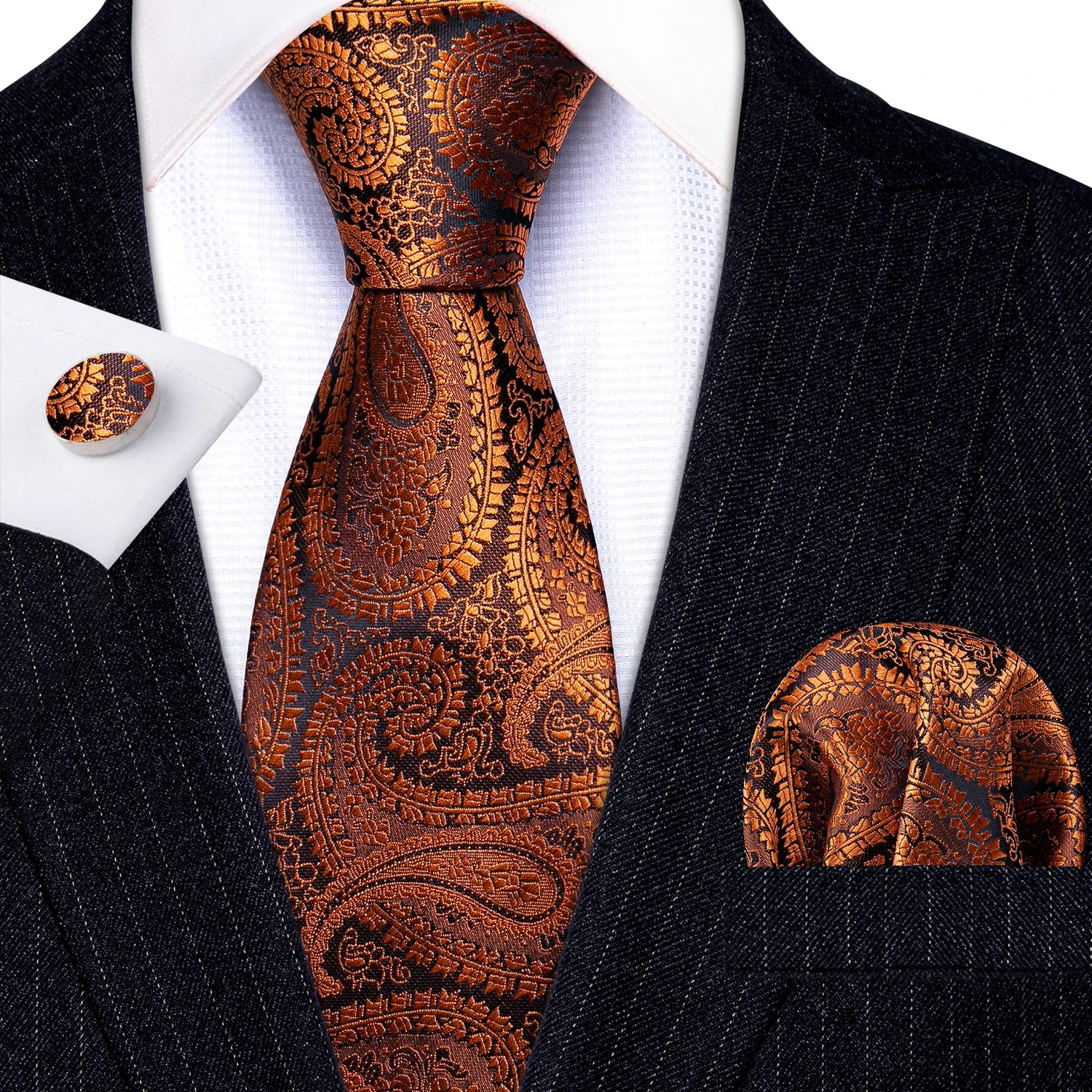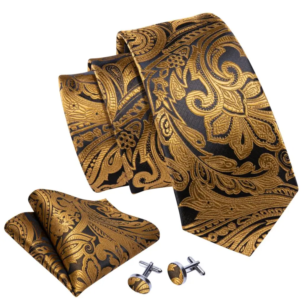 Barry.Wang Gold Silk Mens Tie Hanky Cufflinks Set Yellow Beige Orange Luxury Jacquard Necktie For Male Wedding Business Party