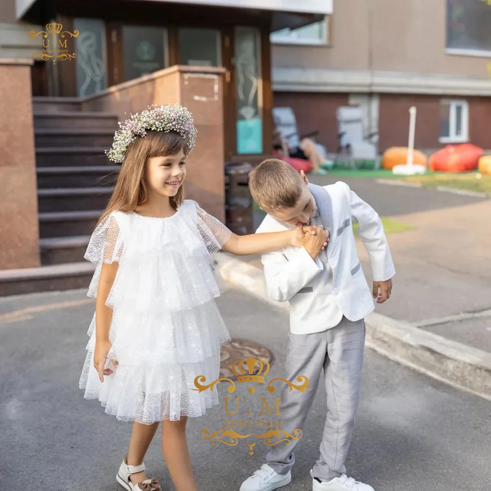 Boys' Linen Suit 2-piece set white Jacket Grey Pants Toddler first communion Outfit, pageboy formal set for wedding ring bearer