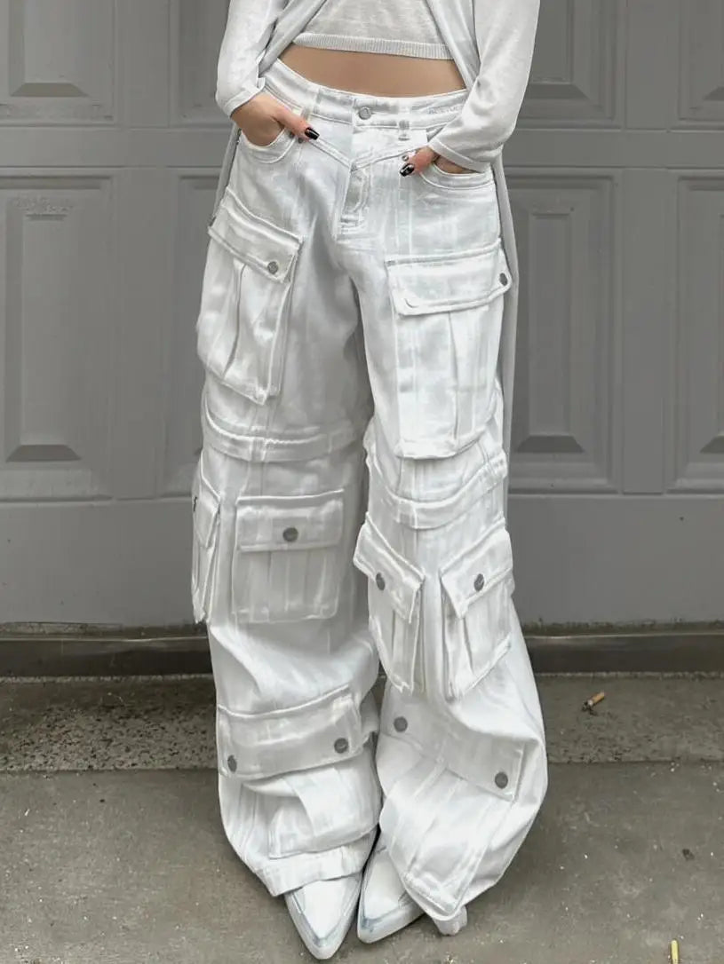 Casual jeans American washed multi-pocket work jeans Y2K retro women's street black straight-leg loose wide-leg pants