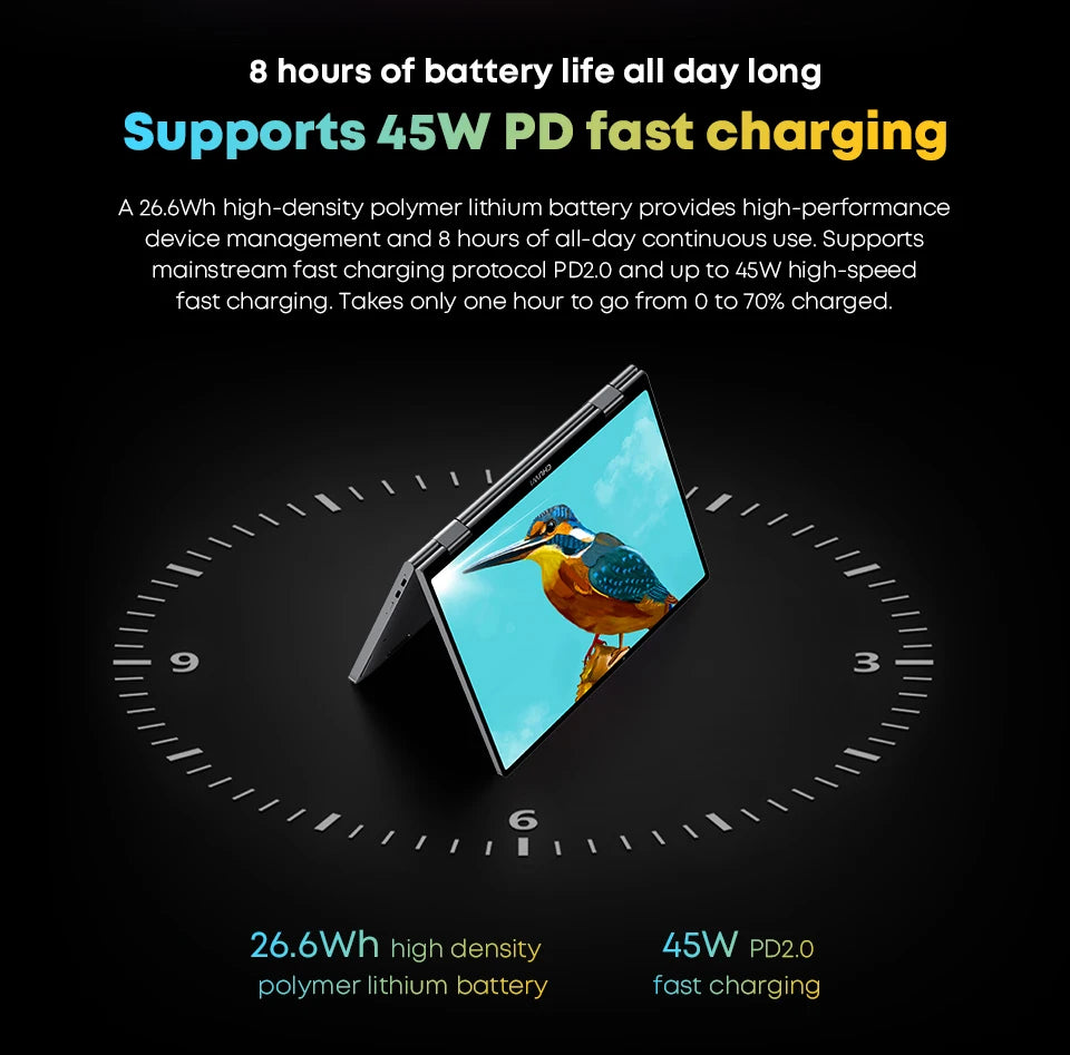 A 26.6Wh high-density polymer lithium battery provides high-performancedevice management and 8 hours of all-day continuous use. Supportsmainstream fast charging protocol PD2.0 and up to 45W high-speeofast charging. Takes only one hour to go from 0 to 70% charged.Personalized Experience withWindows 11 OS