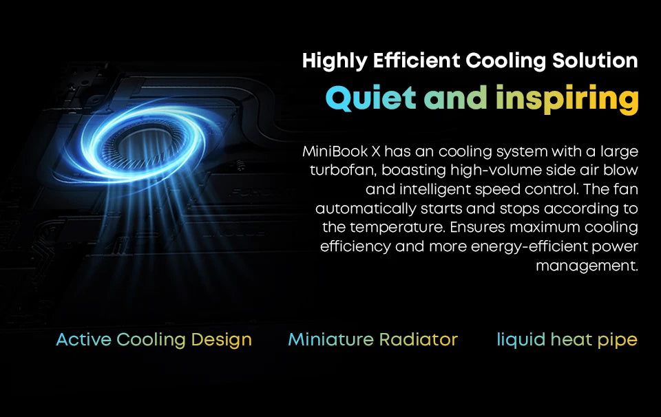 MiniBook X has an cooling system with a largeturbofan, boasting high-volume side air blowand intelligent speed control. The fanautomatically starts and stops according tothe temperature. Ensures maximum coolingefficiency and more energy-efficient powermanagementHigh Performance Capacity Portfolio12GB LPDDR5+512GB SSD