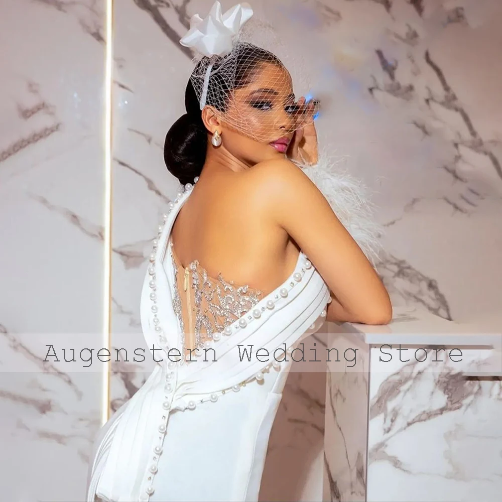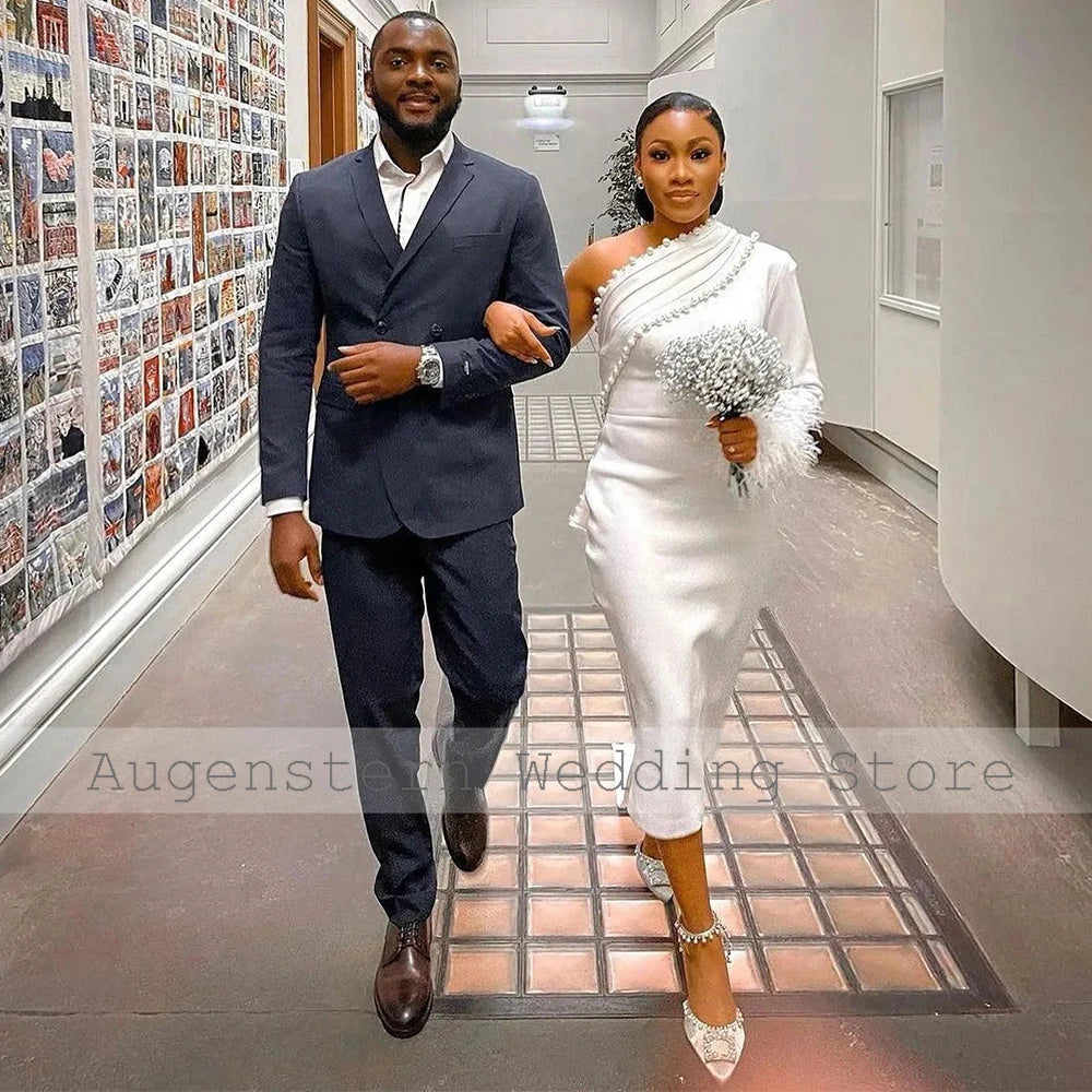 Civil Wedding Dress for Women One Shoulder Feather Long Sleeve Court Gowns Midi Sheath Pearl Applique Bridal Short