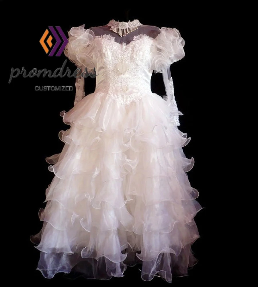 Costume 1980s Victorian Wedding Dress With Ruffles Sleeve Long Sleeve Organza Bridal Dress Tudor Lace Bustle Bride Customized