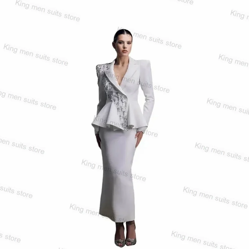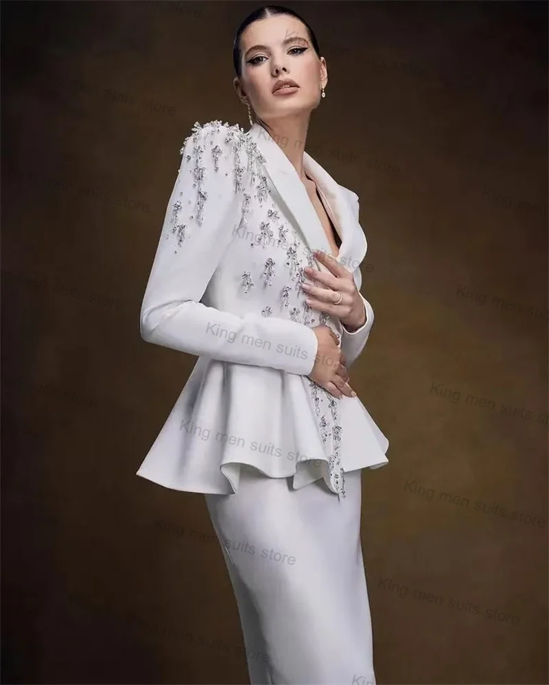 Crystals White Wedding Women Suit Skirt Set 2 Piece Blazer+Midi Prom Dress Custom Made Formal Bride Tuxedo Autumn Jacket Coat