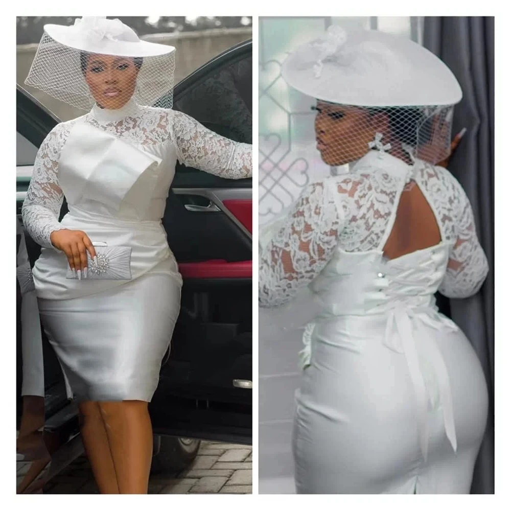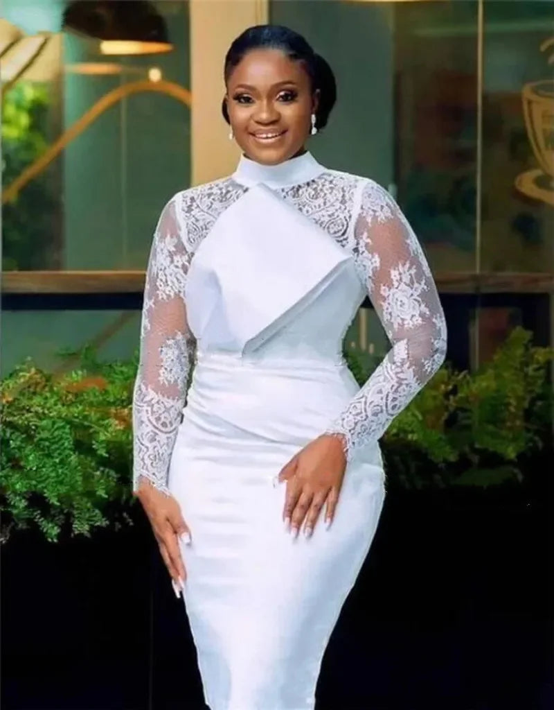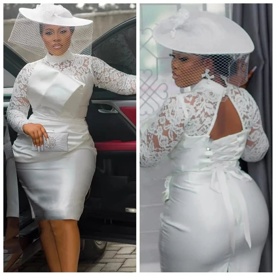 Customized Aso Ebi Short Cocktail Dresses Merimaid High Neck Lace White Wedding Guest Dress Long Sleeves Robe