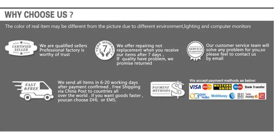 Since your feedback is very important to our business`s development, we sincerely invite you to leave positive feedback for us if you are satisfied with our product and service. It`ll just take you 1 minute. Thank you! if you have any questions please ask me before payment or leave a new message to me when you make it,we will answer you within 24hours.thank you.