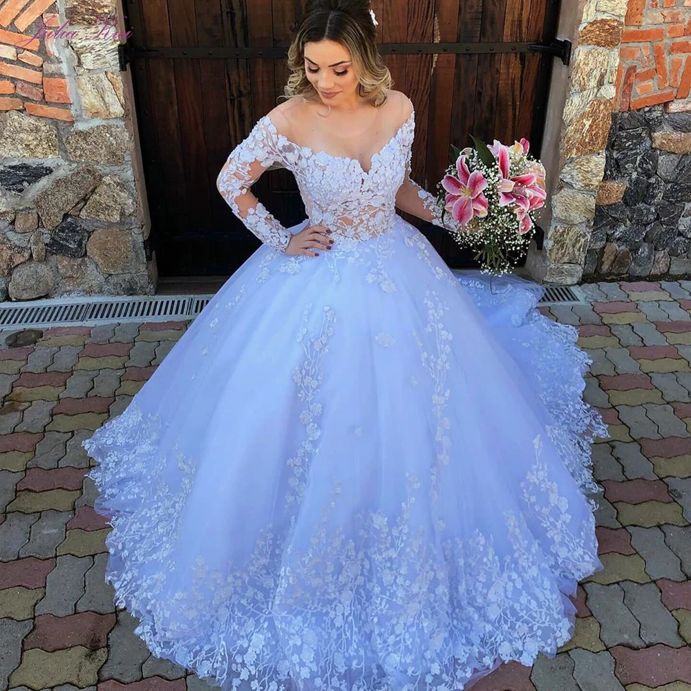 Customized Lace Appliques Long Sleeves Wedding Gowns Princess Tulle Of O-Neck Ball Gown Wedding Dress Plus Size Robe De Mariee