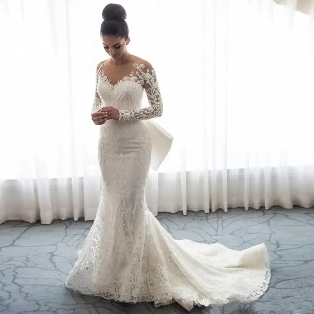 Customized Mermaid Wedding Dresses Sheer Neck Long Sleeves Illusion Full Lace Applique Bow Overskirts Button Back Chapel Train B