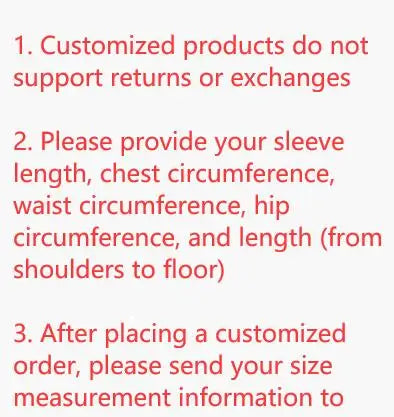 2. Please provide your sleeve length, chest circumference, waist circumference, hip circumference, and length (from shoulders to floor)