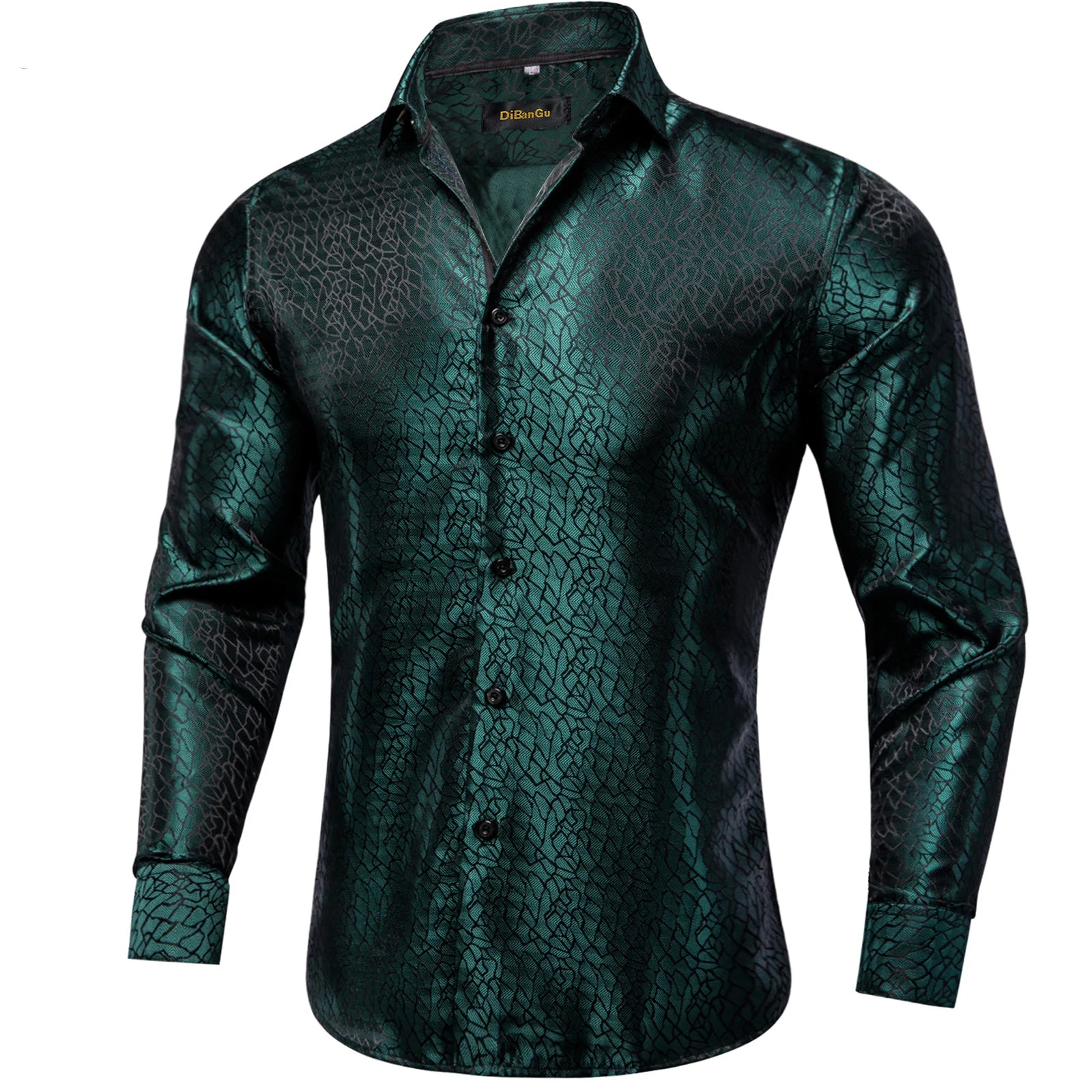 DiBanGu Silk Polyester Dress Shirts for Men Black Solid Paisley Red Silver Long Sleeve Turn Down Collar Prom Social Men's Shirt