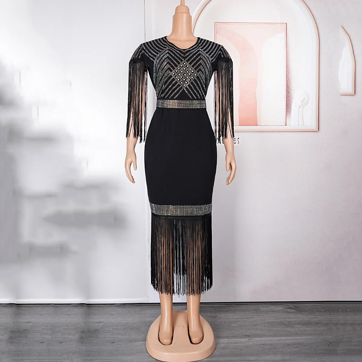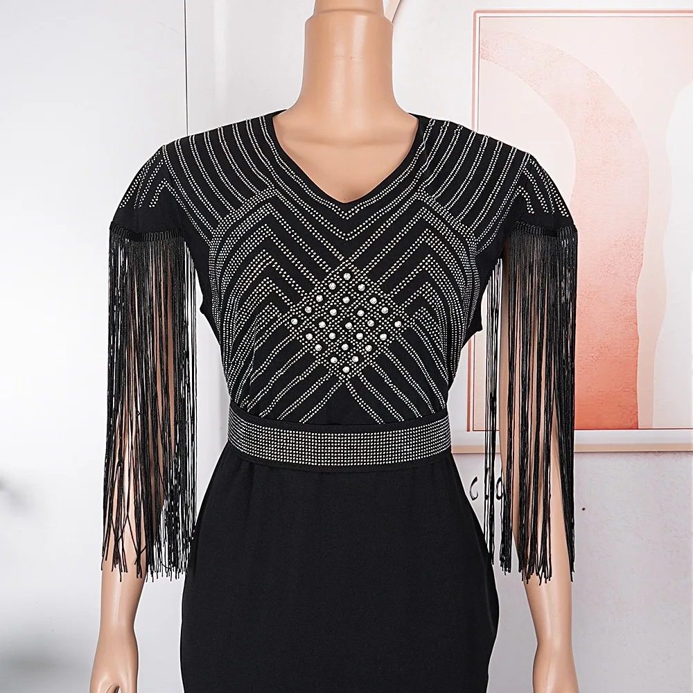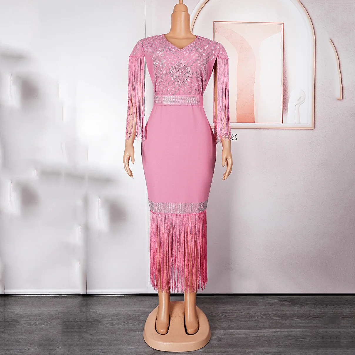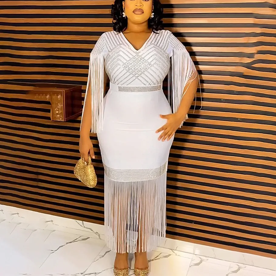 Elegant African Dresses New Trends Luxury Diamond Tassel V Neck Sheath Mid Calf Modest Female Business Work Wear Gowns Clothes