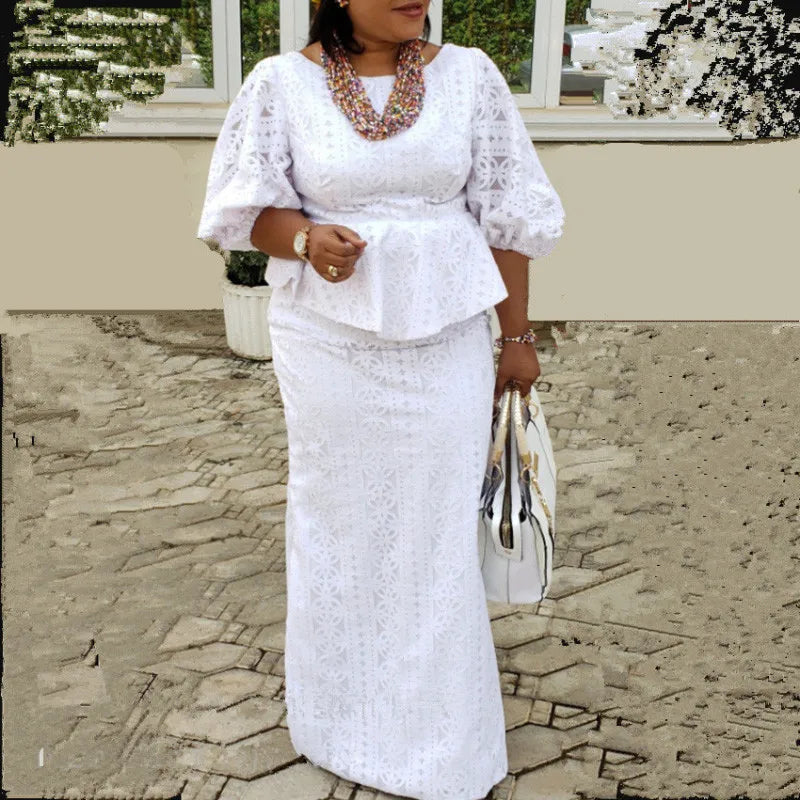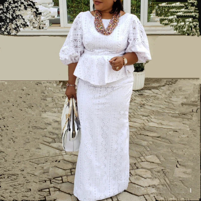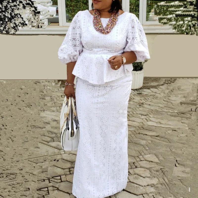 Elegant African Fashion Women Dress Set Retro Embroidery 3/4 Sleeve White 2-piece skirts matching sets