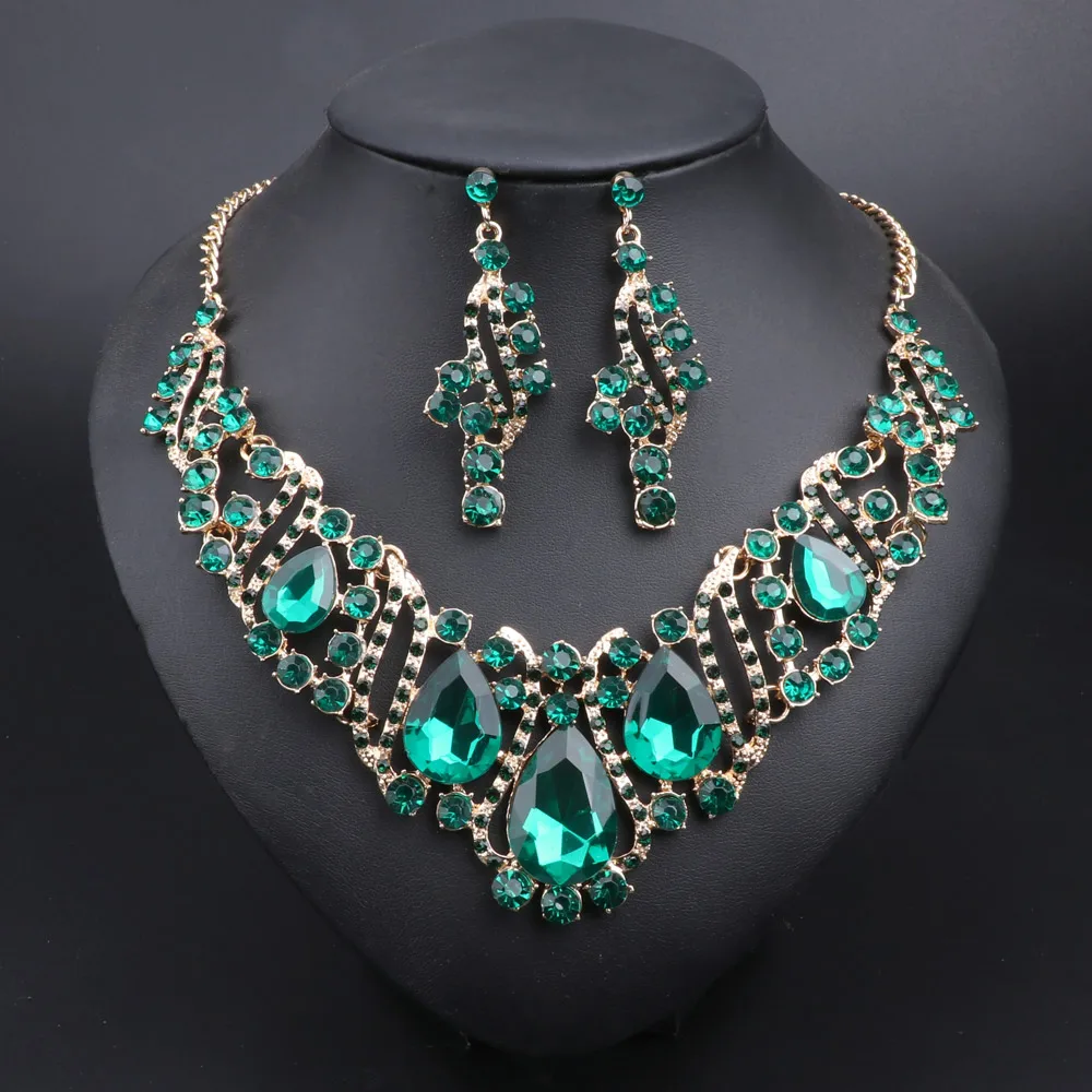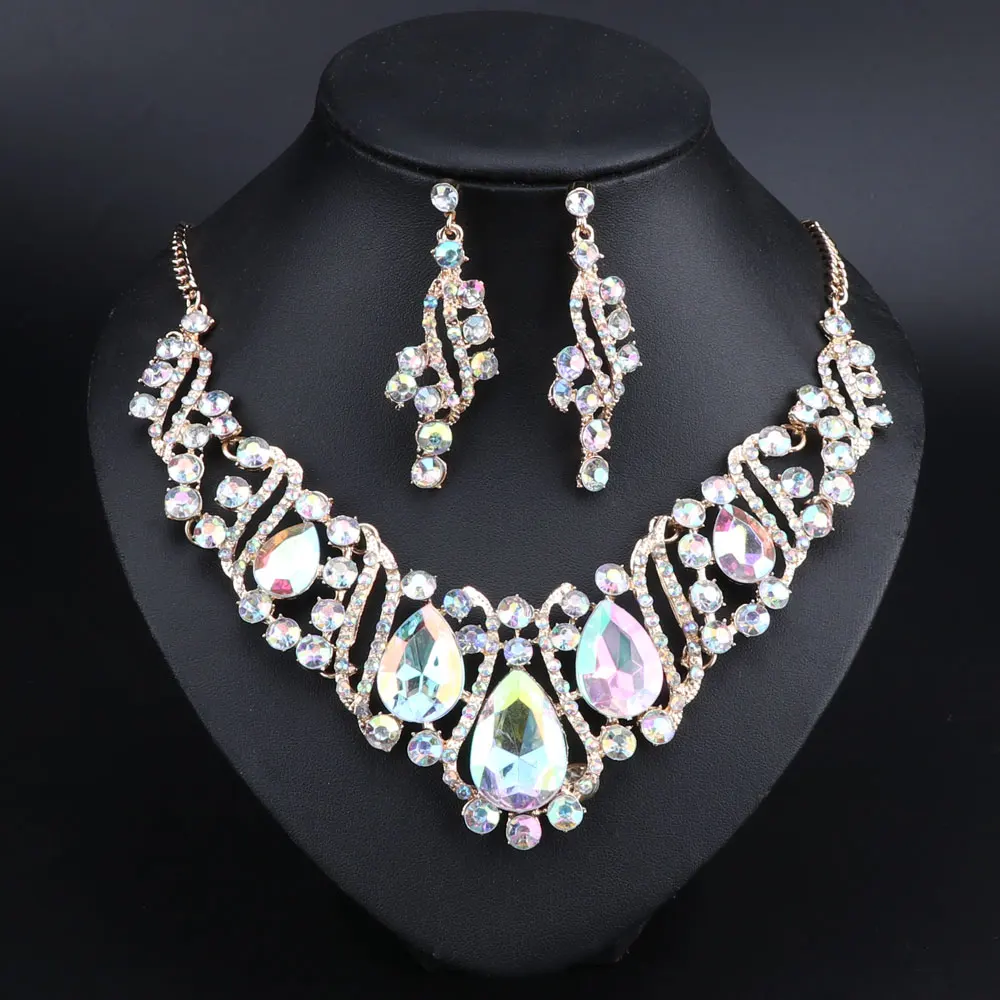 Fashion Crystal Gold Color Necklace Earrings Indian Bridal Jewelry Sets For Brides Wedding Party Costume Accessories Women