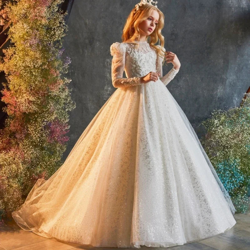 Flower Girls Dress For Wedding Party Butterfly Baptism Gowns Tulle Long Sleeve High Neck Appliques First Communion Gown