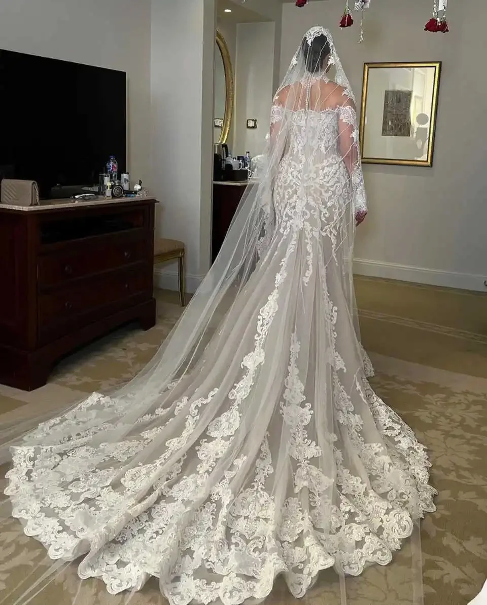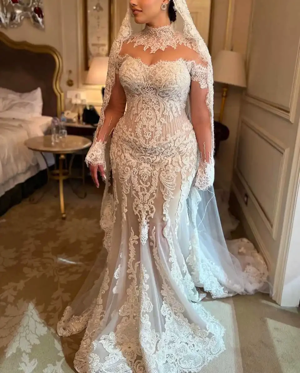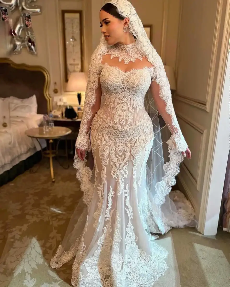 FW Vintage Mermaid Wedding Dresses High Neck Appliques Lace Long Sleeve Bridal Gown Sweep Train Customized Vestido De Noiva