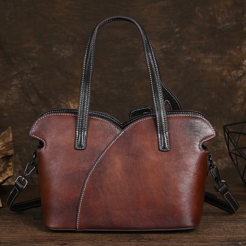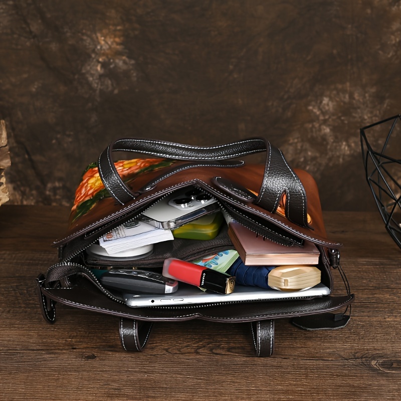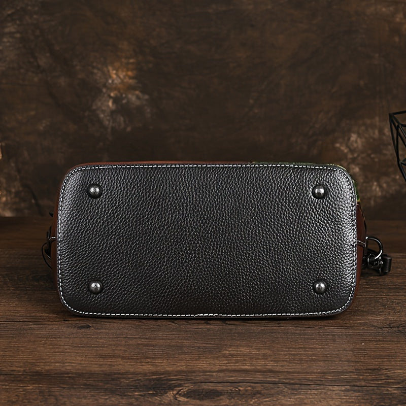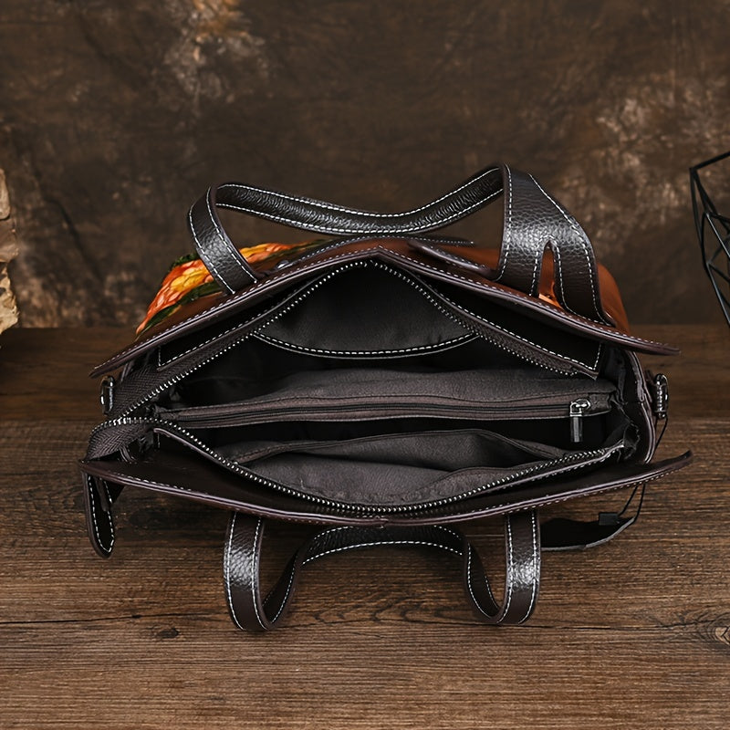 Genuine Genuine Leather Women's Crossbody Bag with Floral Embossed Design - Ethnic Style Coffee & Yellow Handbags, Zipper Closure & Polyester Lining for Casual or Formal Use