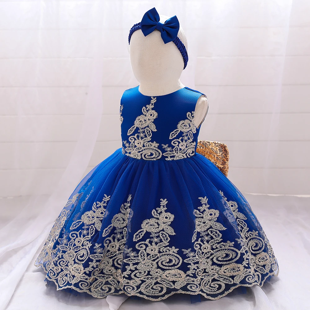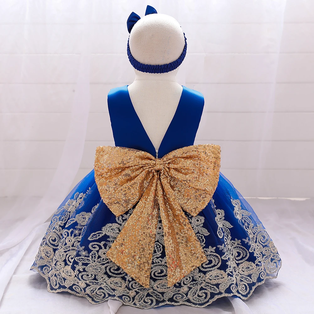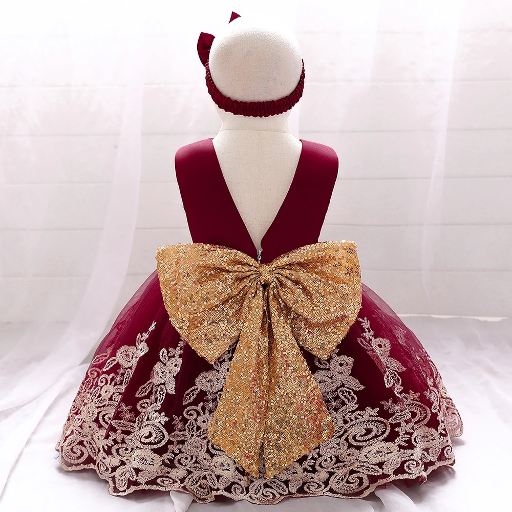 Gold Bow Flower Baby Dress for Girls Christmas Costumes 1st Birthday Party Princess Dresses Wedding Formal Evening Kids Clothing