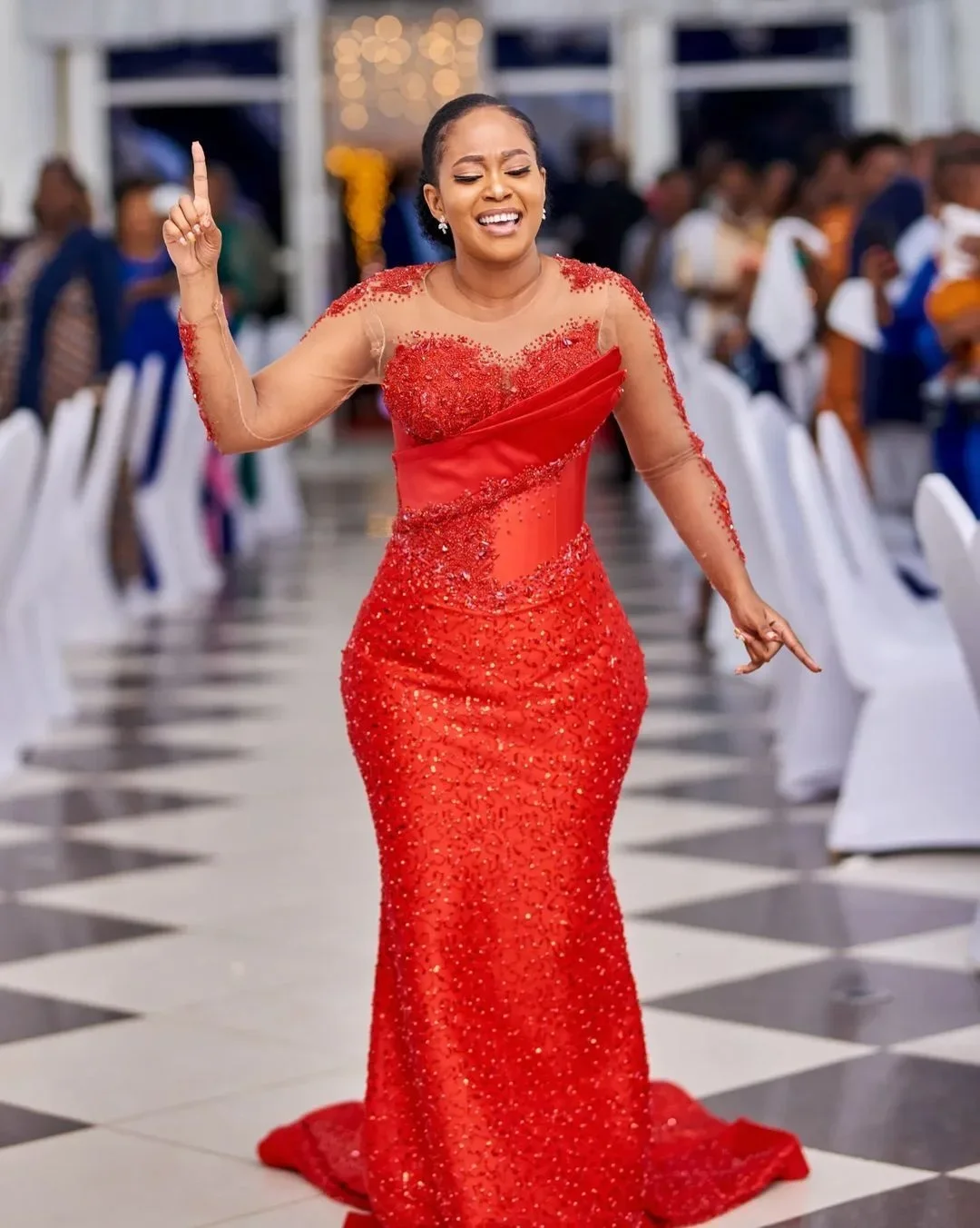 Gorgeous African Red Prom Gown Asoebi Wedding Party Gown Bridal Dress Sheer Long Sleeves Beaded Lace Formal Occasion Dresses