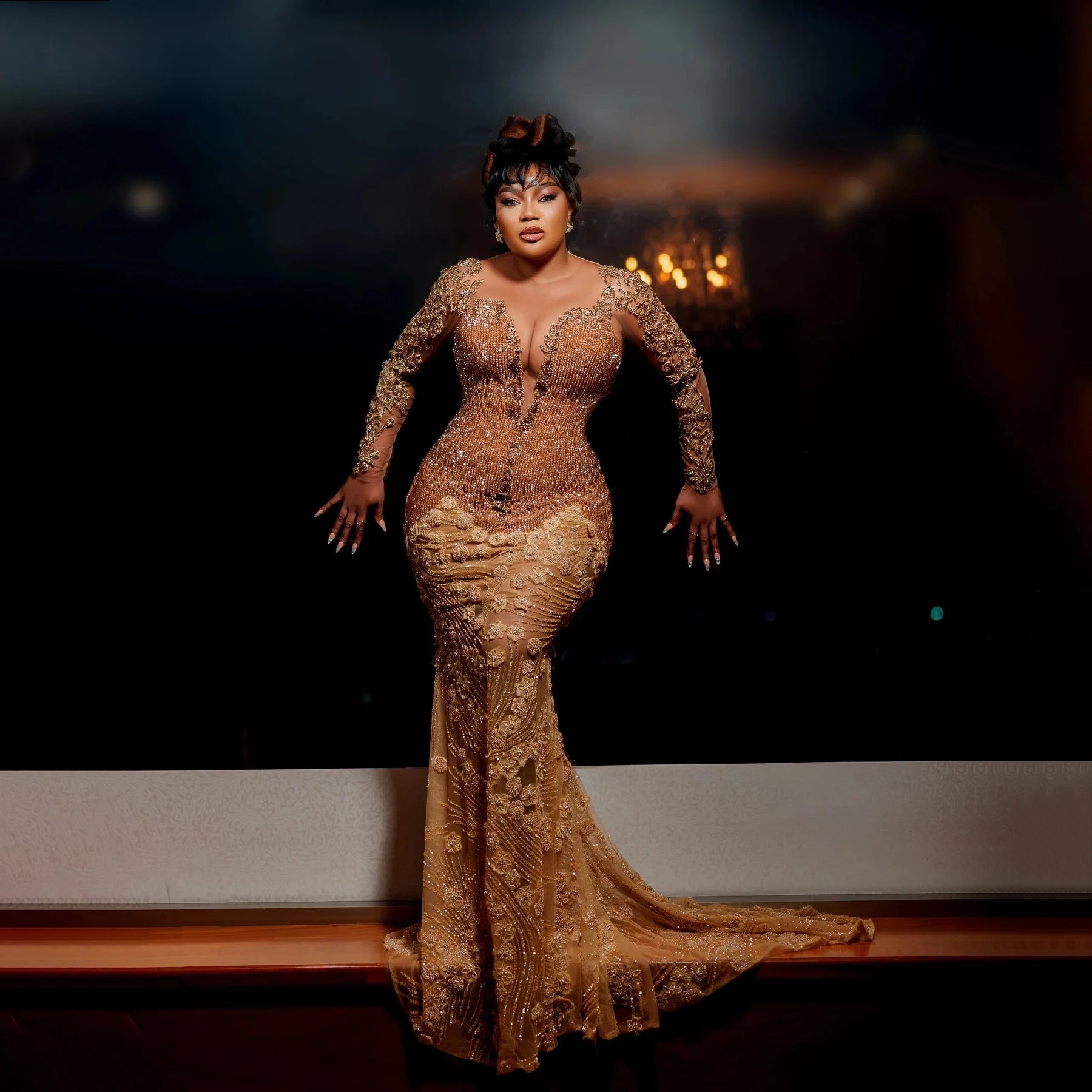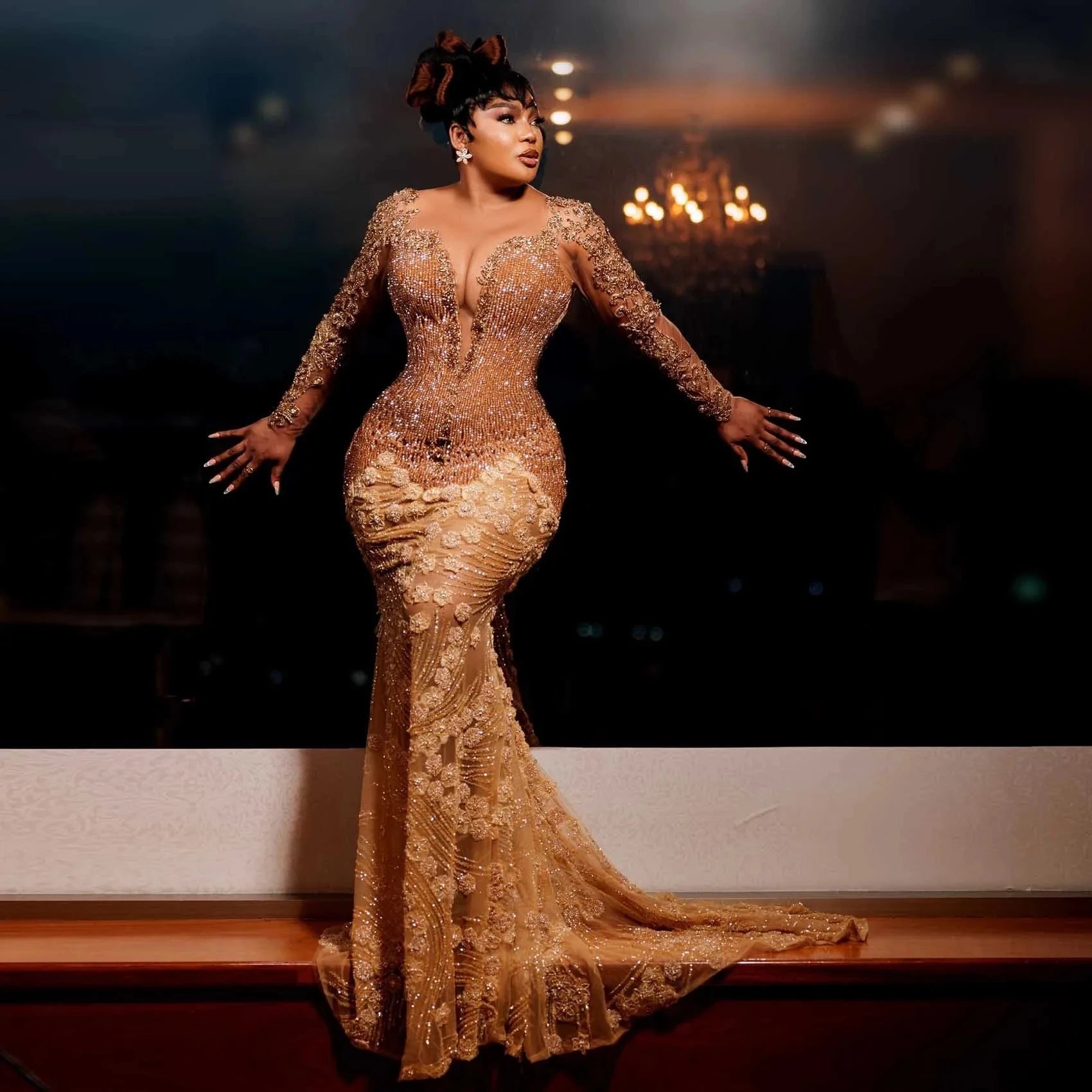 Gorgeous Mermaid Prom Dresses Floral Beading Full Sleeve Prom Gown Black Women Sheer Evening Dress Applique Trumpet Illusions
