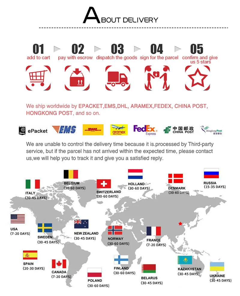 2) If you want fast receive, please choose DHL UPS EMS FEDEX or other fast shipping way, free shipping is slowest!