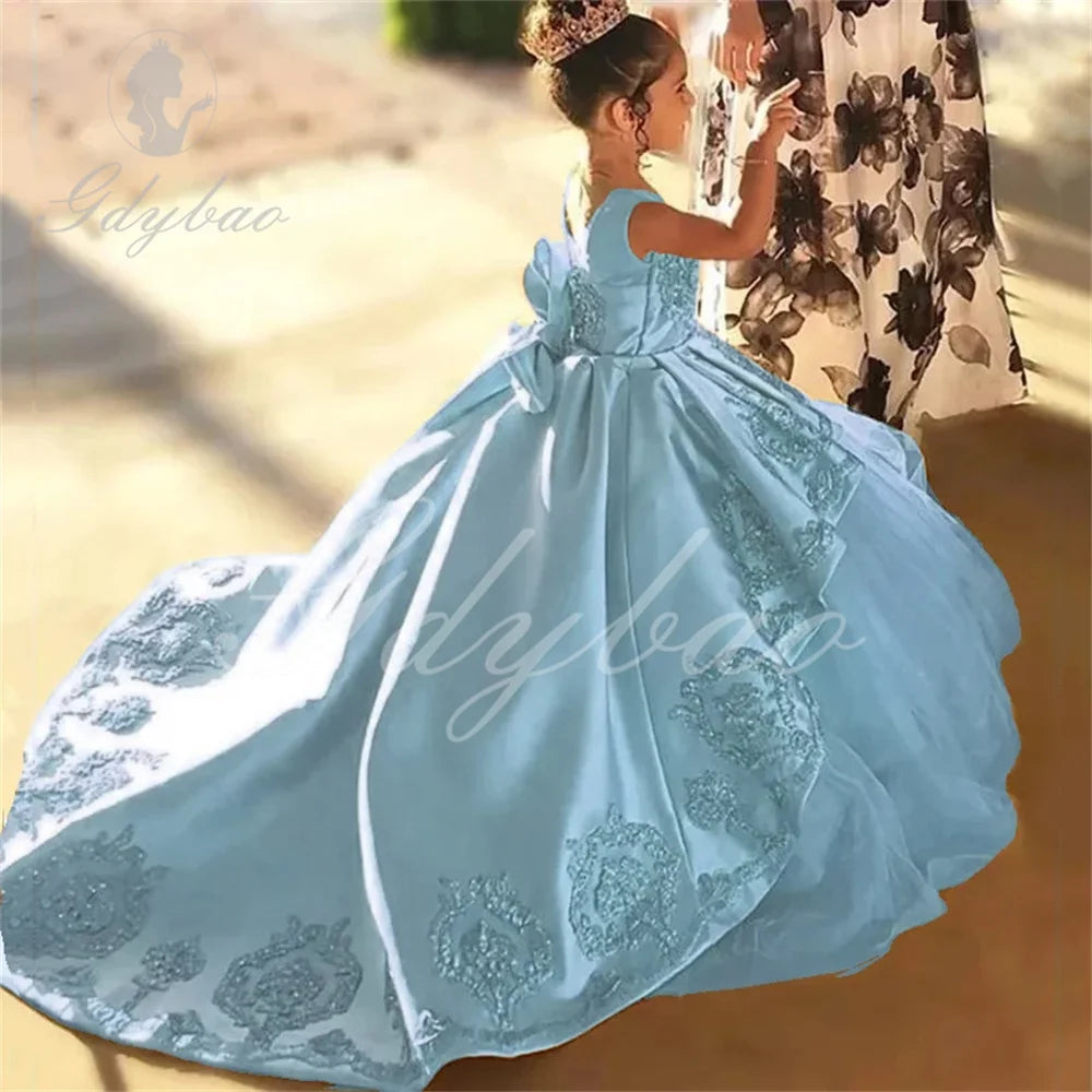 High Quality First Communion Dresses Kids Evening Ball Gown Gold Applique Bow Girls Pageant Dress Satin Tulle Flower Girl Dress
