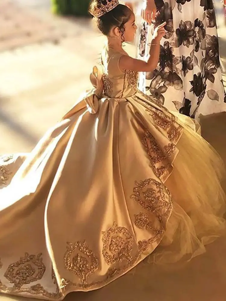 High Quality First Communion Dresses Kids Evening Ball Gown Gold Applique Bow Girls Pageant Dress Satin Tulle Flower Girl Dress