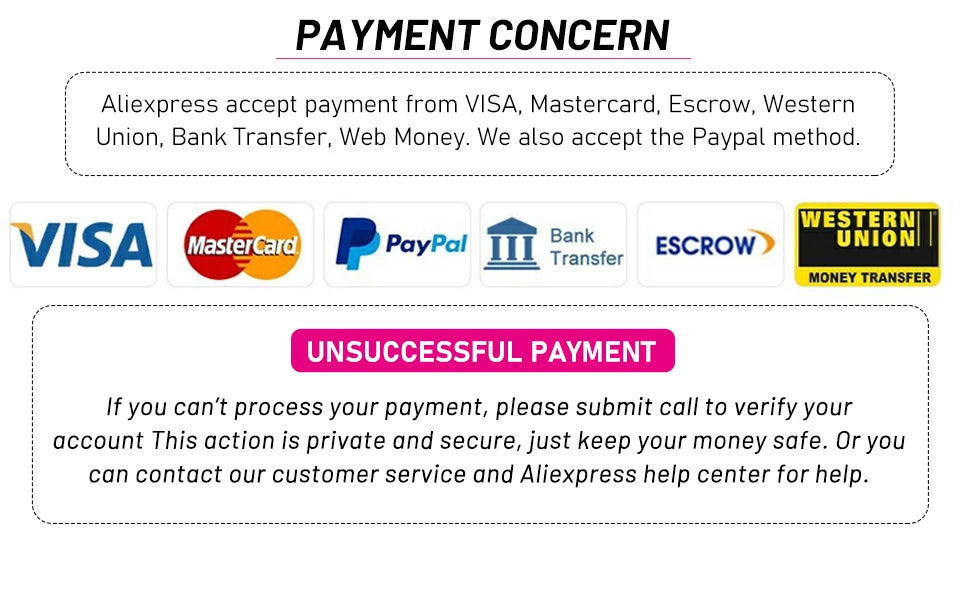 A: AliExpress accept Credit Card, Bank Transfer (TT), Western Union,Money Bookers For payment detail payment failed, please contact us, we'll guide you how to pay