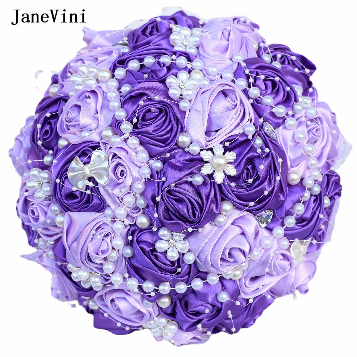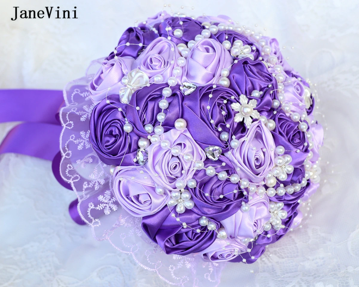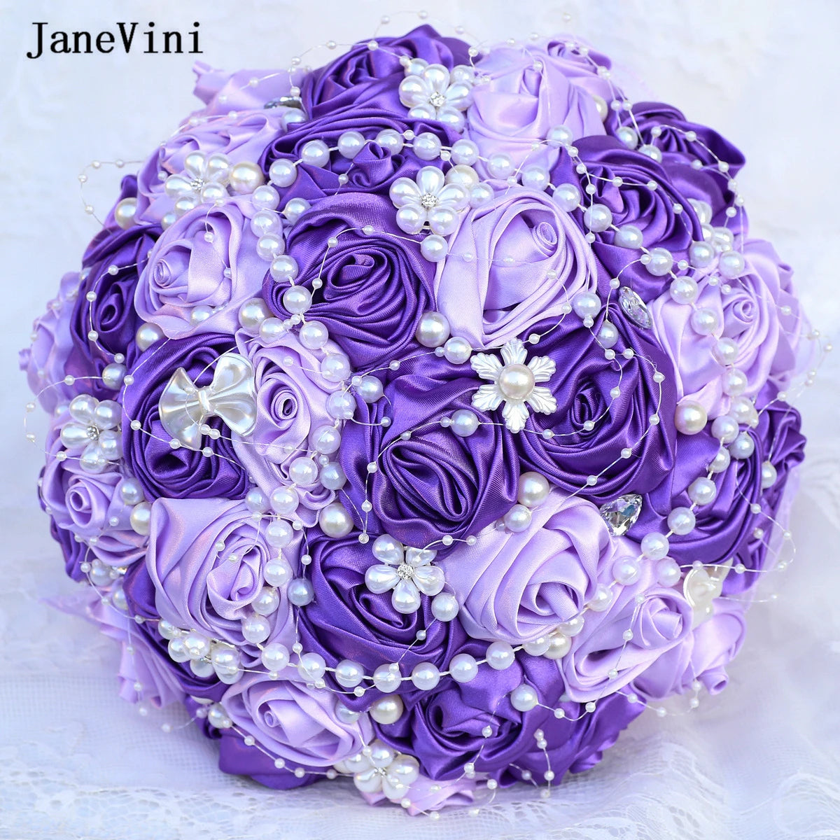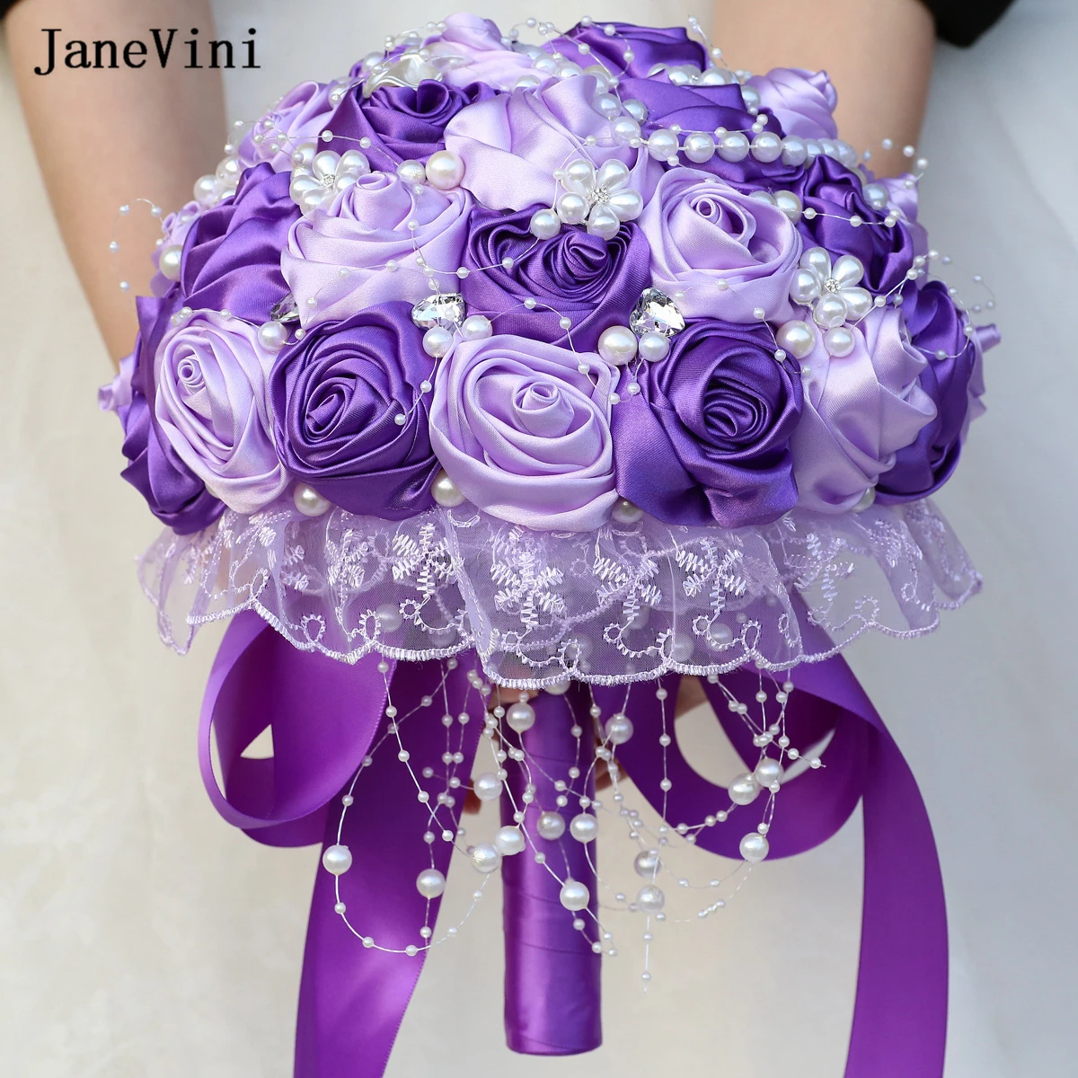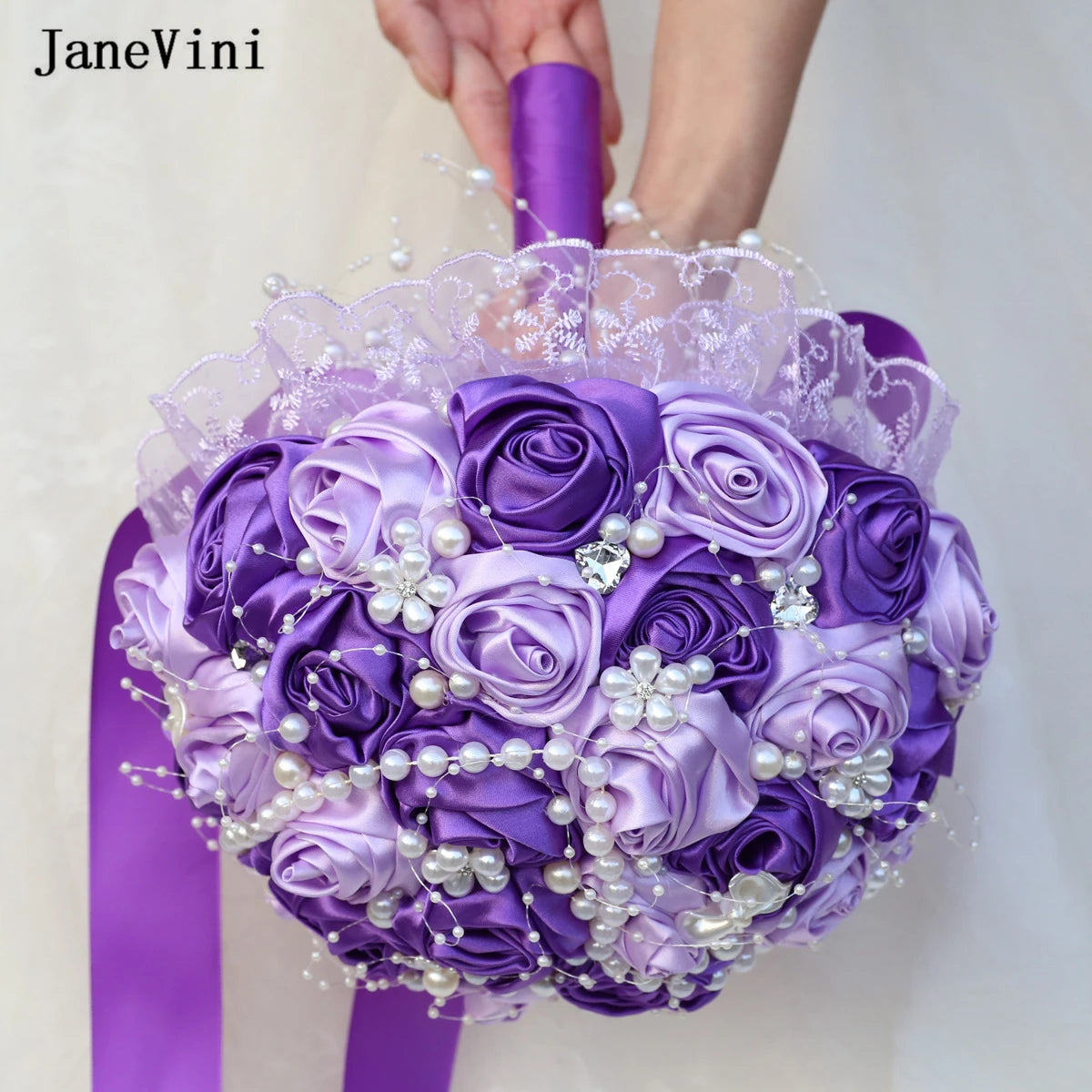JaneVini Stunning Pearls Purple Flowers Bridal Bouquets Ribbon Handle Artificial Satin Roses Bride Bouquet Wedding Accessories