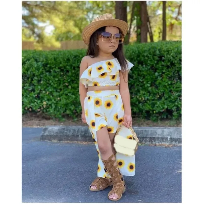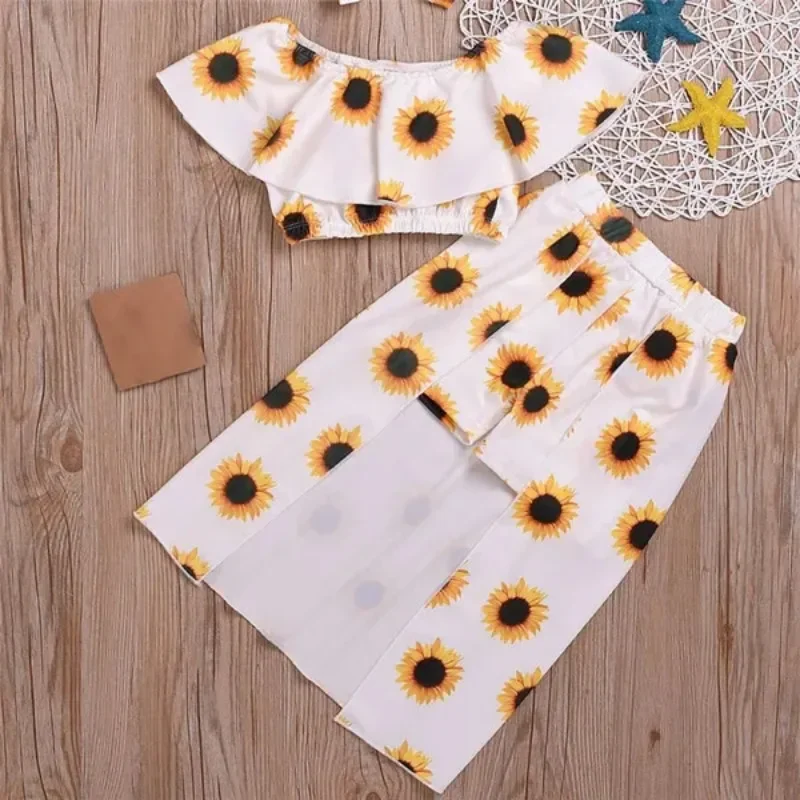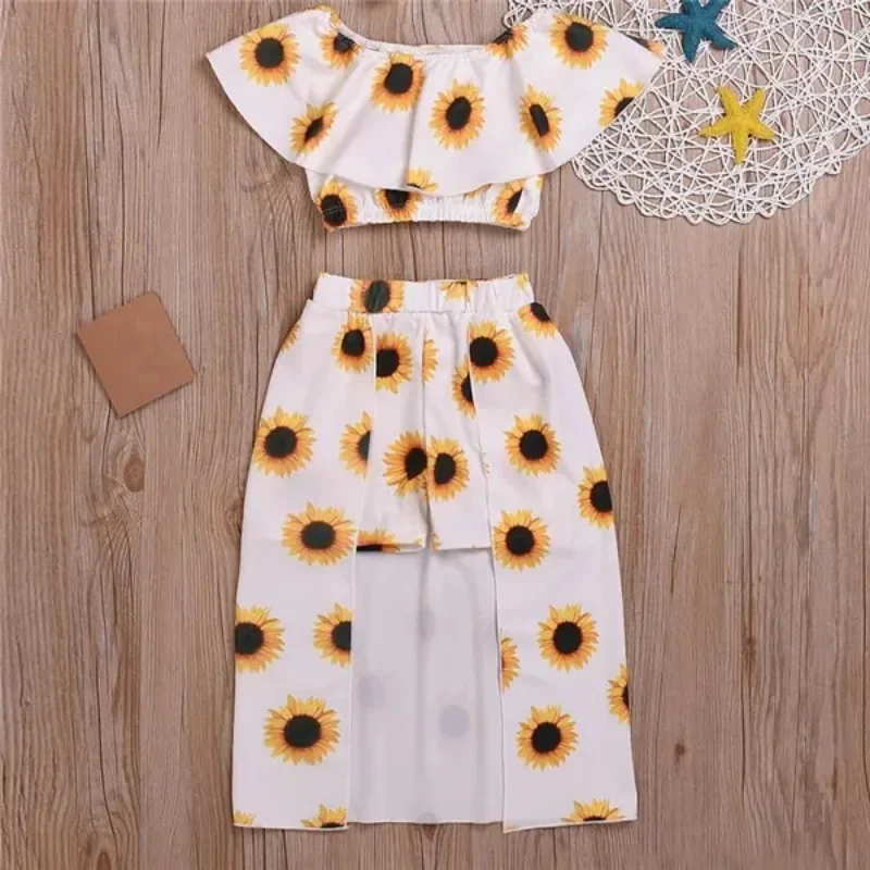 Kids Girls Clothing Sets Floral Print Off Shoulder Crop Top and Culotte Skirt Suits ( Not Include Hats, Bags,Glasses)