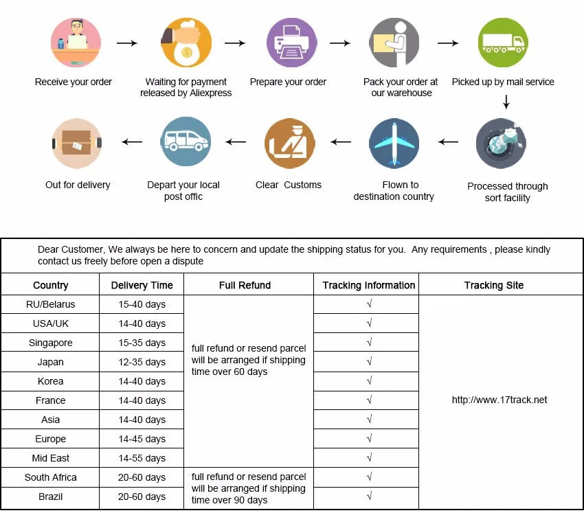 We provide with all kinds of shipping method, like AliExpress Standard Shipping, ePacket,China Post Air,DHL,Postnl,FedEx,EMS. If you want to specify the shipping method, Please contact us and we are happy to help you.