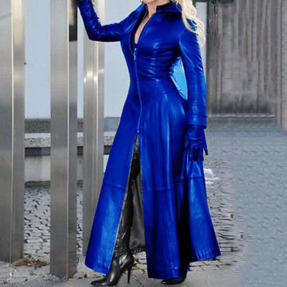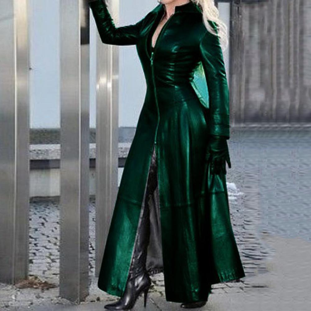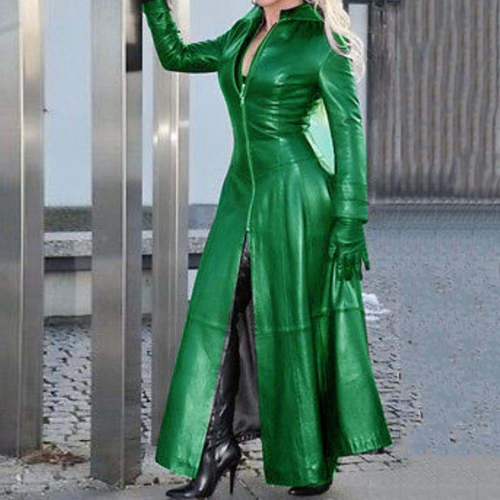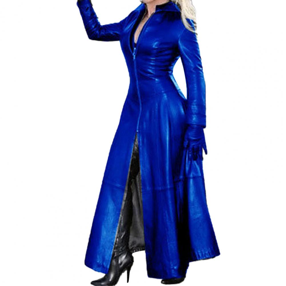 Women Faux Leather Long Jacket Lapel Collar Zipper Placket Cyberpunk Coat Tight Waist Split Hem Casual Loose Solid Color Jacket Fashion Autumn Winter Clothing