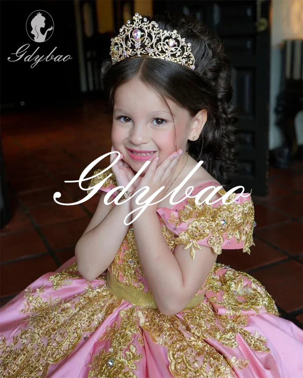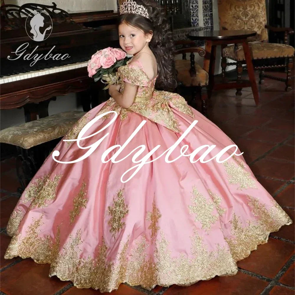 Luxury Golden Applique Full Ball Princess Wedding Party Flower Girl Dress Off The Shoulder Floor Length First Communion Gown New