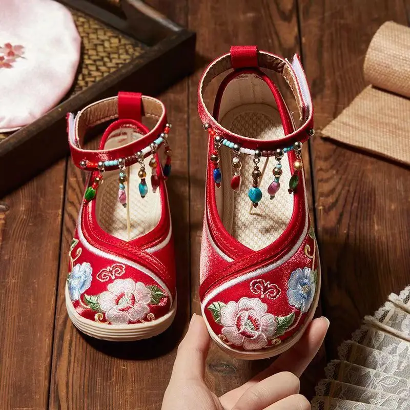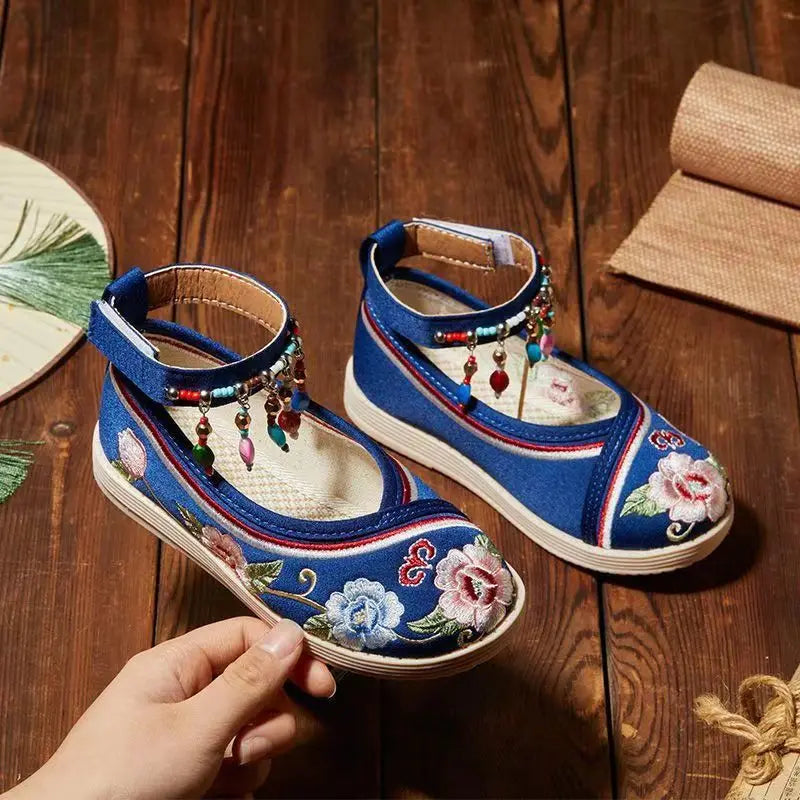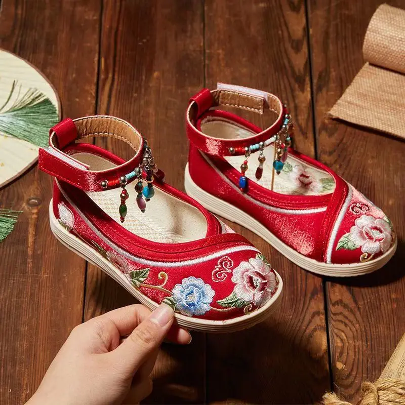 New Children's Ethnic Style Embroidered Canvas Shoes Non Slip Rubber Sole Linen Insole Breathable Hook Hanfu Shoes For Girls