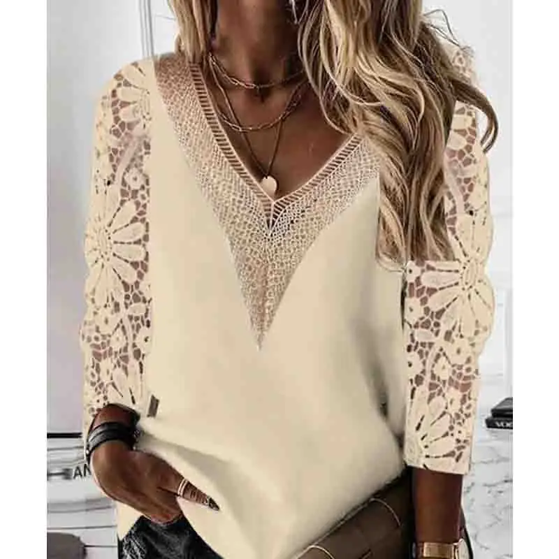 New V-neck Stitching Lace Women Blouse Long Sleeve Spring Hollow Out Chiffon Shirt Casual Tops Loose Clothes Blusas 25948