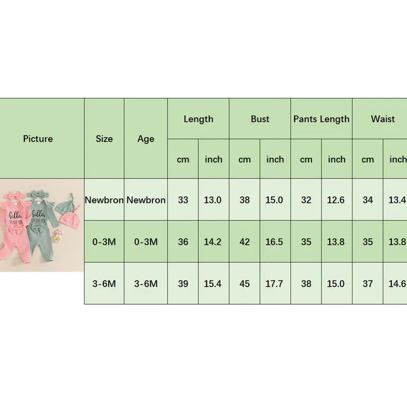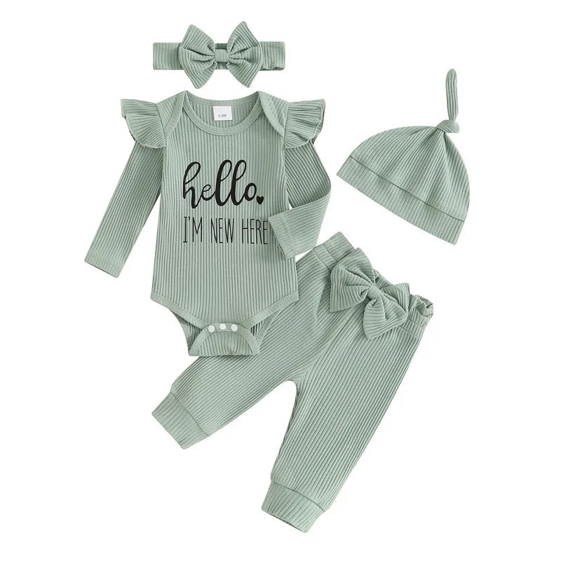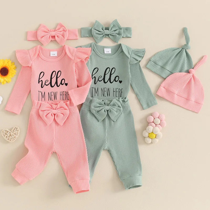 Newborn Baby Girls Autumn 4PCS Sets Long Sleeve Romper Tops Ribbed Pants Headband Hat Sets