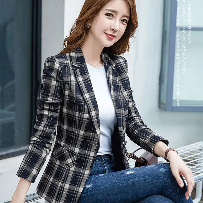PEONFLY Vintage Casual Plaid Blazer Women Fashion Single Button Office Ladies Jacket Coat Notched Collar Long Sleeve Jacket 2023