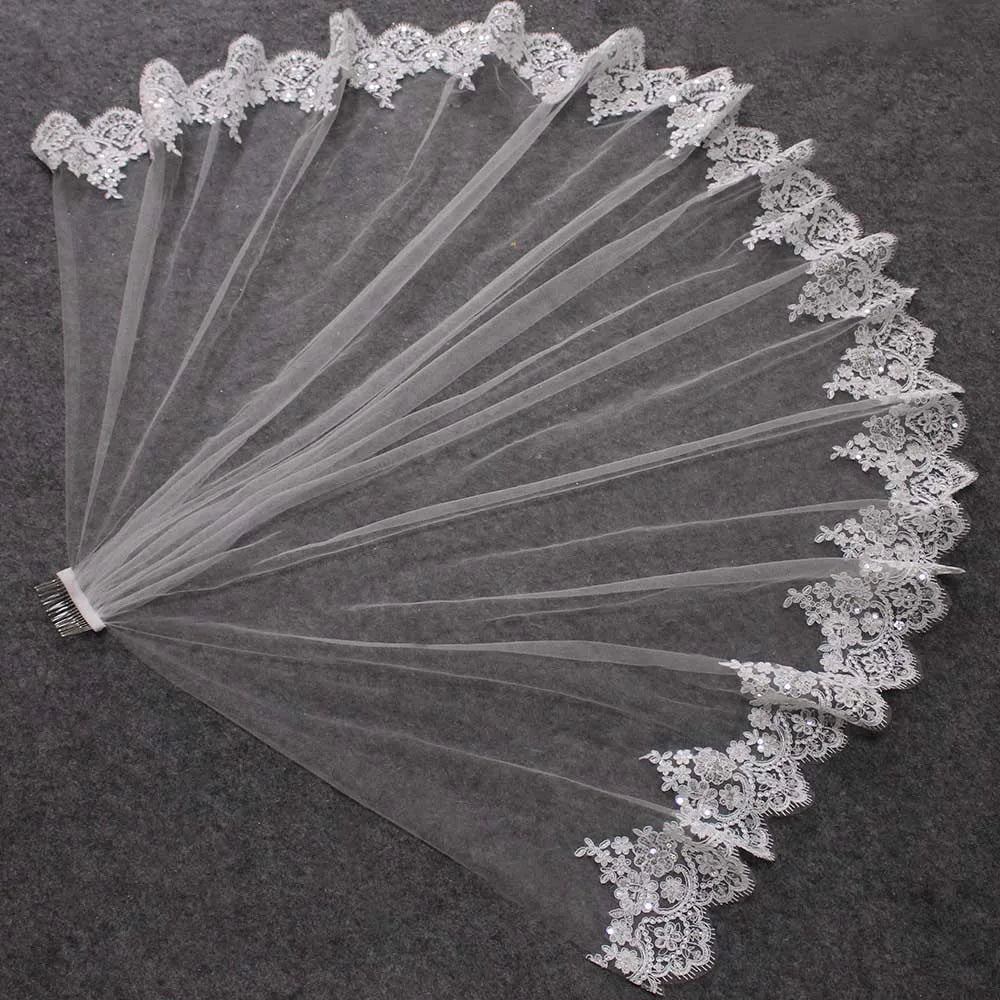 Short Lace Wedding Veil with Comb Bling Sequins Lace One Layer Bridal Veil White Ivory Veil for Bride Welon
